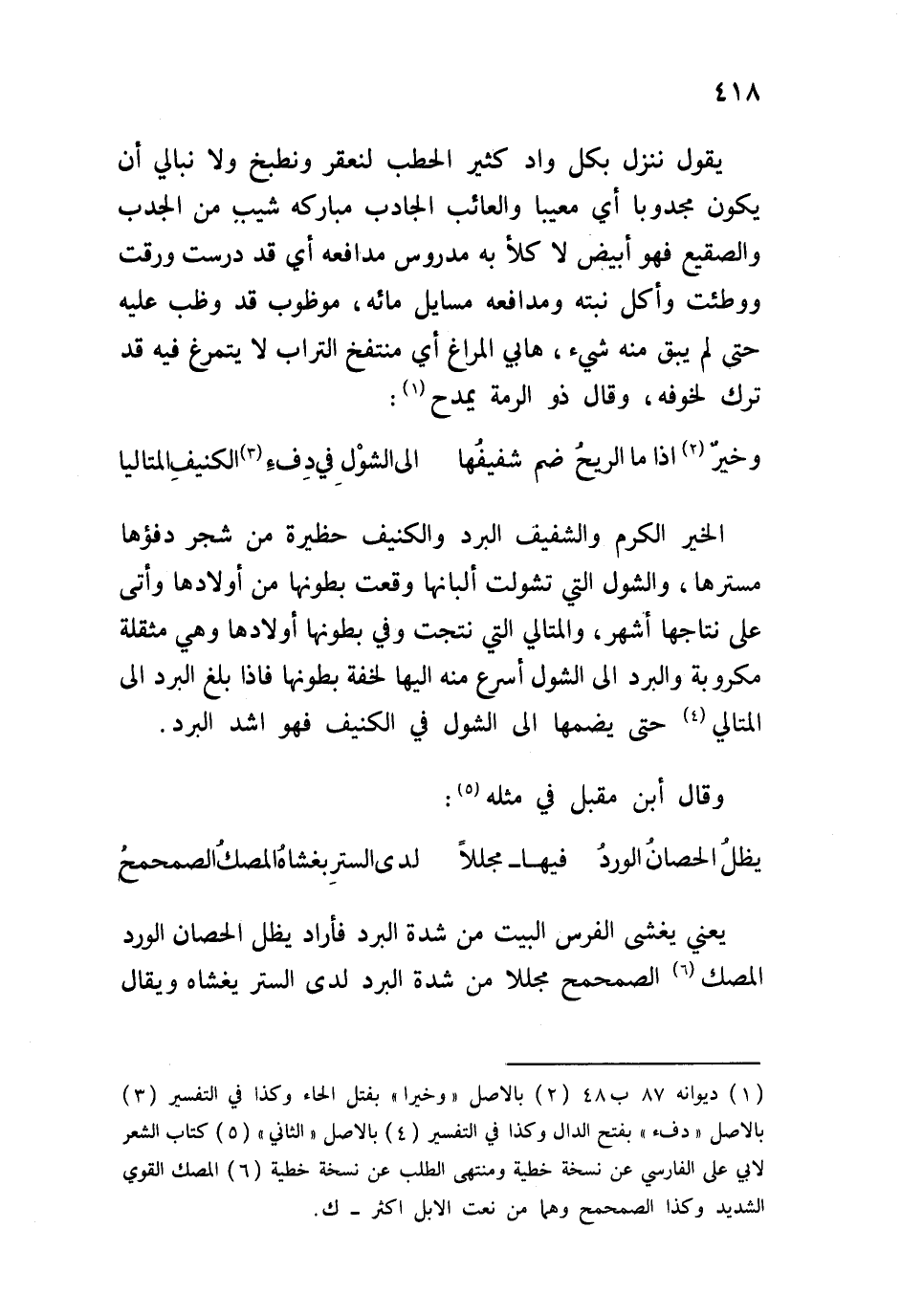 يقول ننزل بكل واد كثير الحطب لنعقر ونطبخ ولا نبالي أن يكون مجدوباً أي معيباً والعائب الجادب مباركه شيب من الجدب والصقيع فهو أبيض لا كلأ به مدروس مدافعه أي قد درست ورقت ووطئت وأكل نبته ومدافعه مسايل مائه، موظوب قد وظب عليه حتى لم يبق منه شيء، هابي المراغ أي منتفخ التراب لا يتمرغ فيه قد ترك لخوفه، وقال ذو الرمة يمدح: