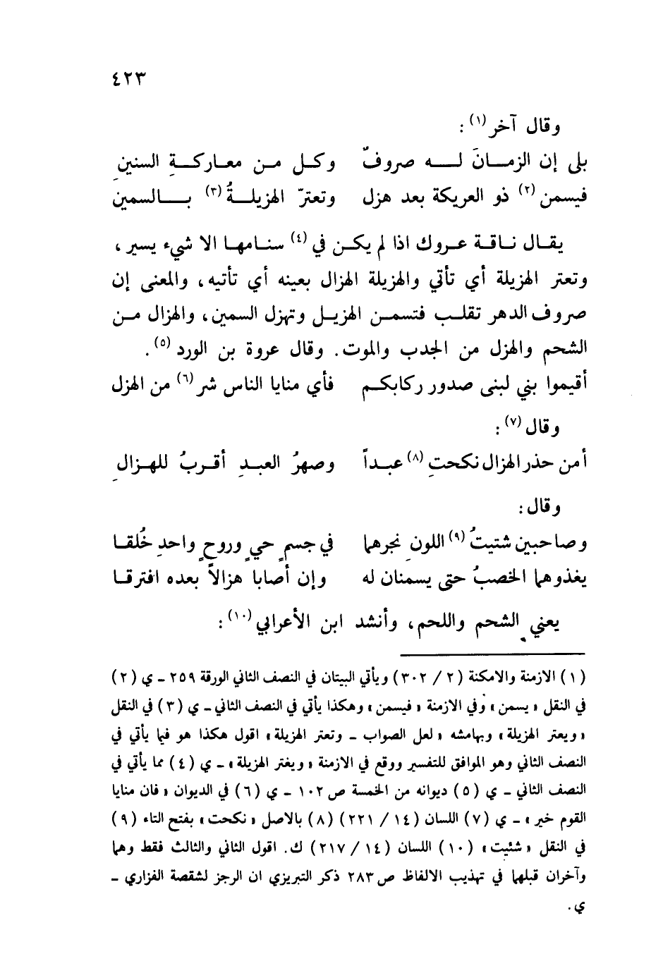 يقال ناقة عروك إذا لم يكن في سنامها إلا شيء يسير، وتعتر الهزيلة أي تأتي والهزيلة الهزال بعينه أي تأتيه، والمعنى إن صروف الدهر تقلب فتسمن الهزيل وتهزل السمين، والهزال من الشحم والهزل من الجدب والموت. وقال عروة بن الورد: