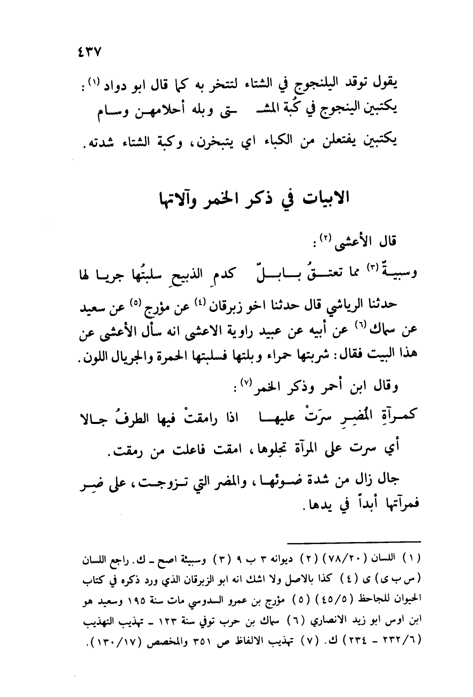 حدثنا الرياشي قال حدثنا أخو زبرقان عن مؤرج عن سعيد عن سماك عن أبيه عن عبيد راوية الأعشى أنه سأل الأعشى عن هذا البيت فقال: شربتها حمراء وبلتها فسلبتها الحمرة والجريال اللون.