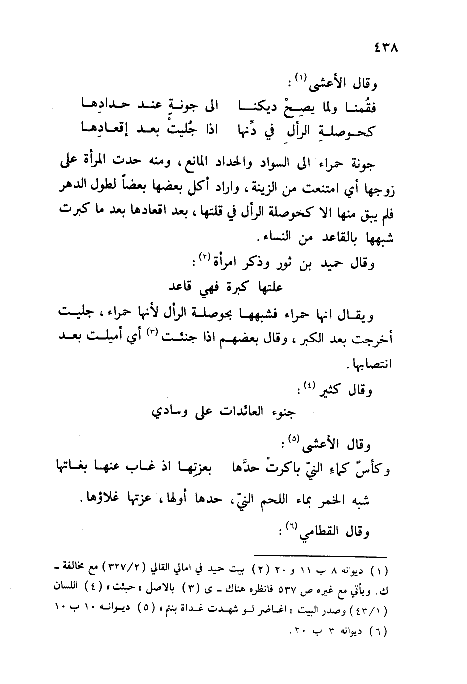 جونة حمراء إلى السواد والحداد المانع، ومنه حدت المرأة على زوجها أي امتنعت من الزينة، وأراد أكل بعضها بعضاً لطول الدهر فلم يبق منها إلا كحوصلة الرأل في قلتها، بعد ٌقعادها بعد ما كبرت شبهها بالقاعد من النساء.