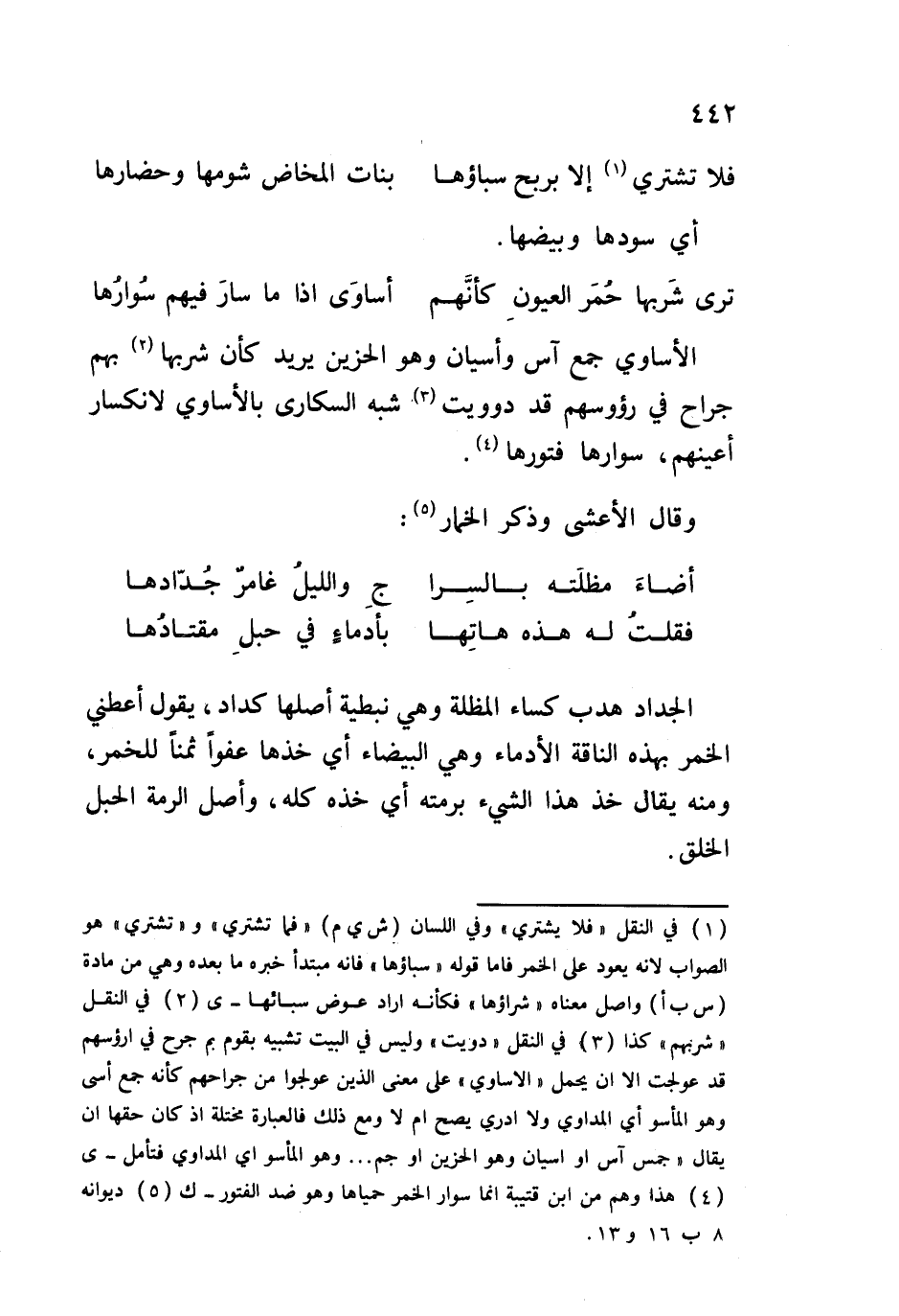الجداد هدب كساء المظلة وهي نبطية أصلها كداد، يقول أعطني الخمر بهذه الناقة الأدماء وهي البيضاء أي خذها عفواً ثمناً للخمر، ومنه يقال خذ هذا الشيء برمته أي خذه كله، وأصل الرمة الحبل الخلق.