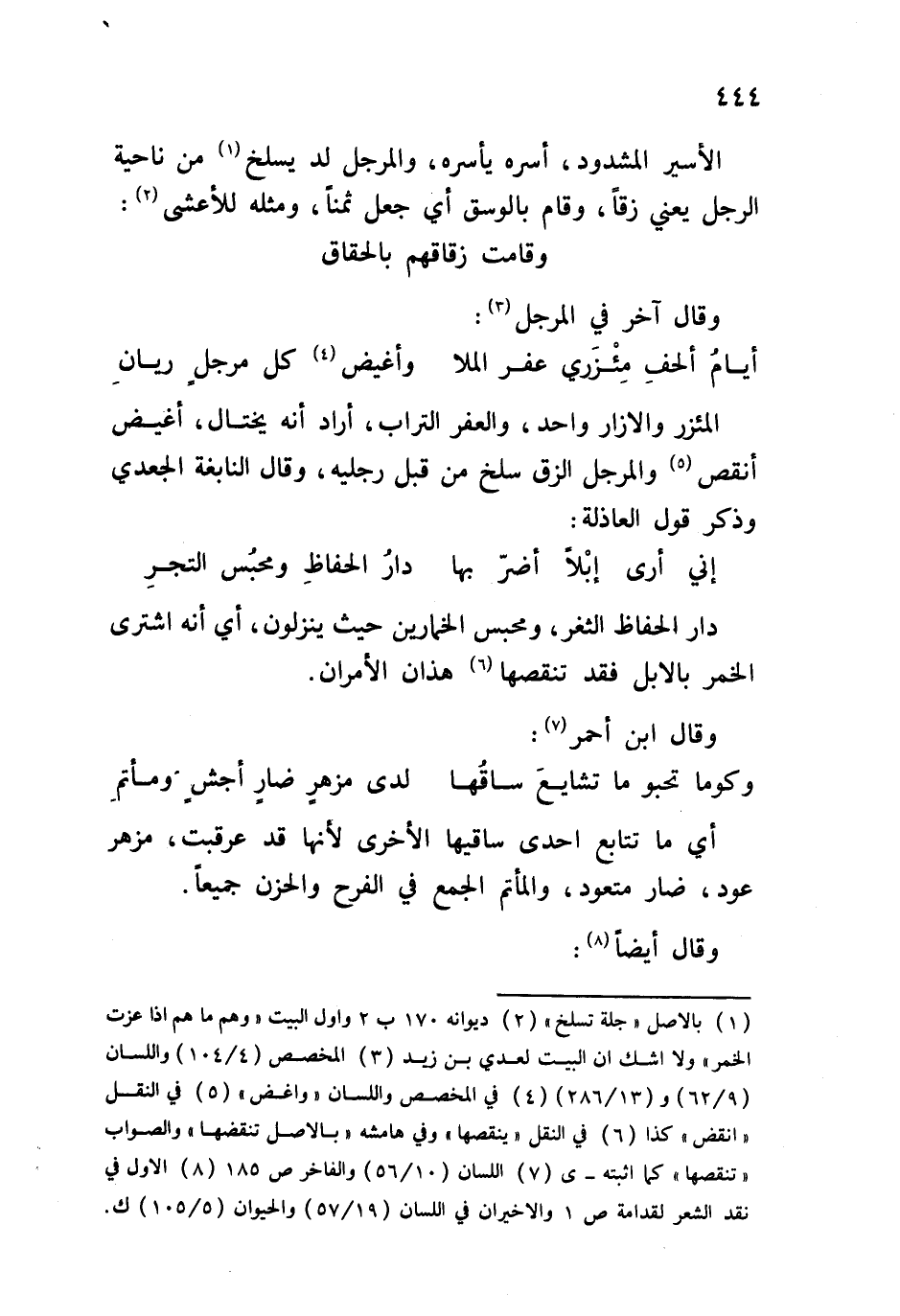 المئزر والإزار واحد، والعفر التراب، أراد أنه يختال، أغيض أنقص والمرجل الزق سلخ من قبل رجليه، وقال النابغة الجعدي وذكر قول العاذلة: