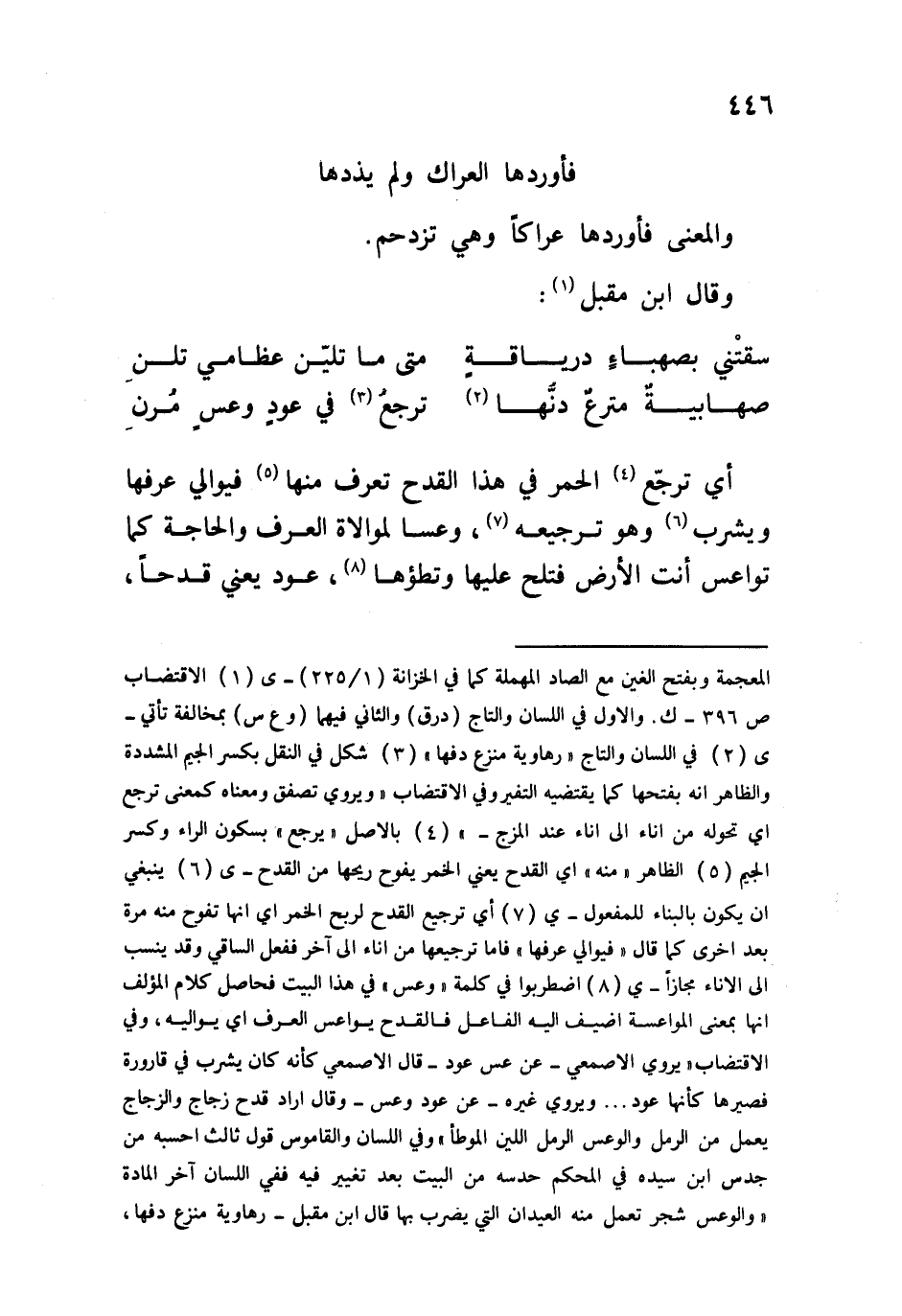 أي ترجع الحمر في هذا القدح تعرف منها فيوالي عرفها ويشرب وهو ترجيعه، وعسا لموالاة العرف والحاجة كما تواعس أنت الأرض فتلح عليها وتطؤها، عود يعني قدحاً،