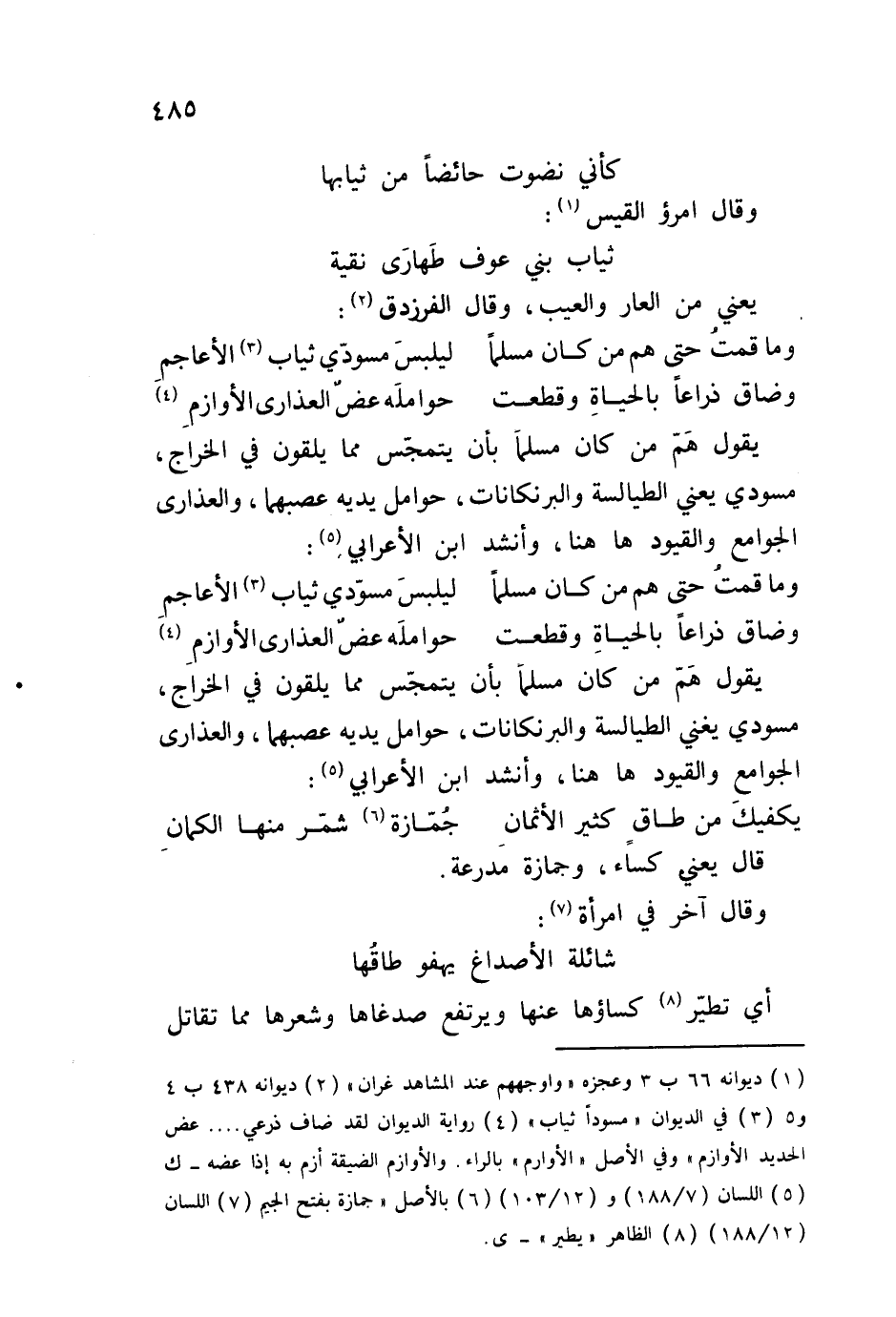 يقول هم من كان مسلماً بأن يتمجس مما يلقون في الخراج، مسودي يعني الطيالسة والبرنكانات، حوامل يديه عصبهما، والعذارى الجوامع والقيود هاهنا، وأنشد ابن الأعرابي: