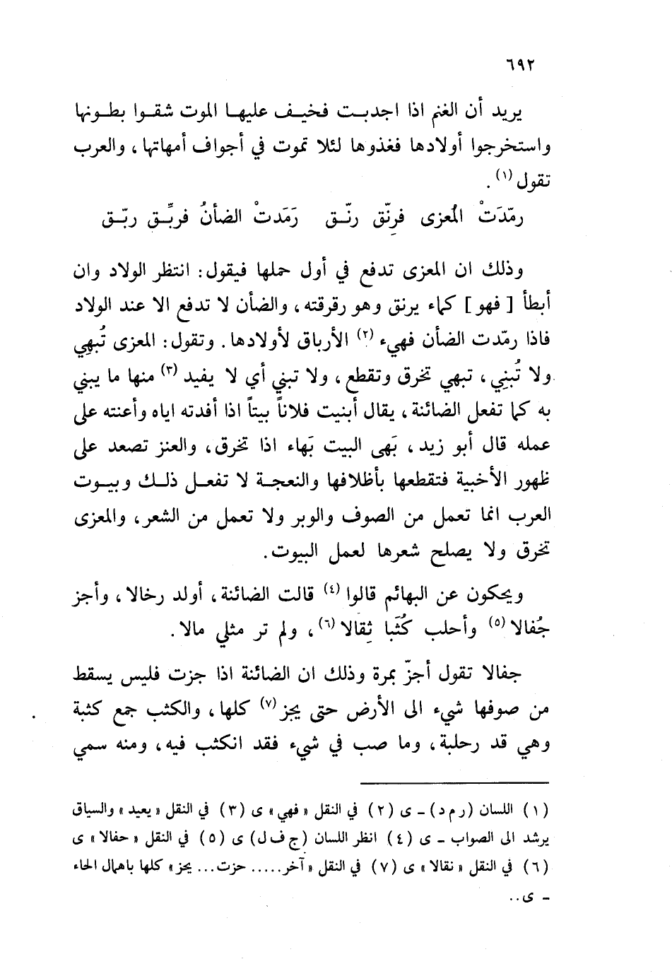 وذلك أن المعزى تدفع في أول حملها فيقول: انتظر الولاد وإن أبطأ فهو كماء يرنق وهو رقرقته، والضأن لا تدفع إلا عند الولاد فإذا رمّدت الضأن فهي الأرباق لأولادها. وتقول: المعزى تبهي ولاتبني، تبهي تخرق وتقطع، ولا تبني أي لا يفيد منها ما يبني به كما تفعل الضائنة، يقال أبنيت فلاناً بيتاً إذا أفدته إياه وأعنته على عمله قال أبو زيد، بهى البيت بهاء إذا تخرق، والعنز تصعد على ظهور الأخبية فتقطعها بأظلافها والنعجة لا تفعل ذلك وبيوت العرب إنما تعمل من الصوف والوبر ولا تعمل من الشعر، والمعزى تخرق ولا يصلح شعرها لعمل البيوت. ويحكون عن البهائم قالوا قالت الضائنة، أولد رخالا، وأجز جفالا وأحلب كثبا ثقالا، ولم تر مثلي مالا. جفالا تقول أجزّ بمرة وذلك أن الضائنة إذا جزت فليس يسقط من صوفها شيء إلى الأرض حتى يجز كلها، والكثب جمع كثبة وهي قد رحلبة، وما صب في شيء فقد انكثب فيه، ومنه سمي