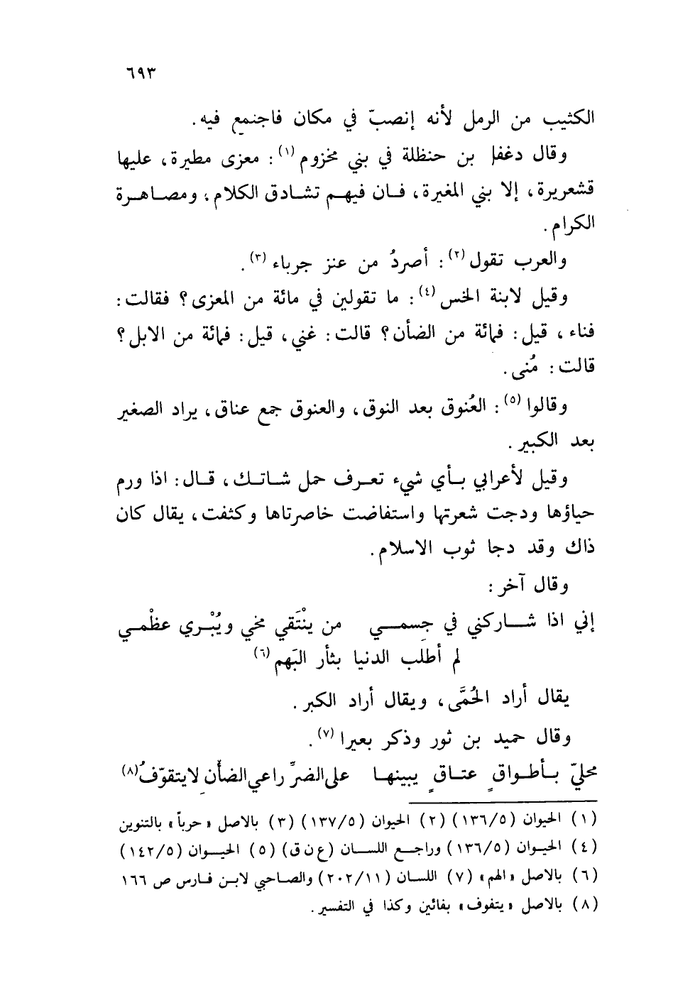 الكثيب من الرمل لأنه انصب في مكان فاجتمع فيه. وقال دغفل بن حنظلة في بني مخزوم: معزى مطيرة، عليها قشعريرة، إلا بني المغيرة، فإن فيهم تشادق الكلام، ومصاهرة الكرام. والعرب تقول: أصرد من عنز جرباء. وقيل لابنة الخس: ما تقولين في مائة من المعزى؟ فقالت: فناء، قيل: فمائة من الضأن؟ قالت: غني، قيل: فمائة من الإبل؟ قالت: منى. وقالوا: العنوق بعد النوق، والعنوق جمع عناق، يراد الصغير بعد الكبير. وقيل لأعرابي بأي شيء تعرف حمل شاتك، قال: إذا ورم حياؤها ودجت شعرتها واستفاضت خاصرتاها وكثفت، يقال كان ذاك وقد دجا ثوب الإسلام. وقال آخر: