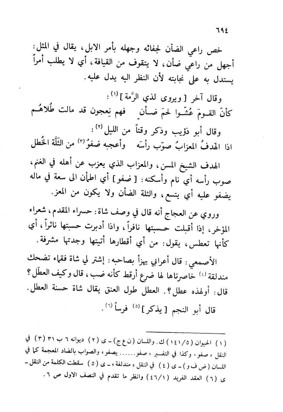 الهدف الشيخ المسن، والمعزاب الذي يعزب عن أهله في الغنم، صوّب رأسه أي نام وأسكنه: ضفو أي اطمأن إلى سعة في ماله يضفو عليه أي يتسع، والثلّة الضأن ولا يكون من المعز.