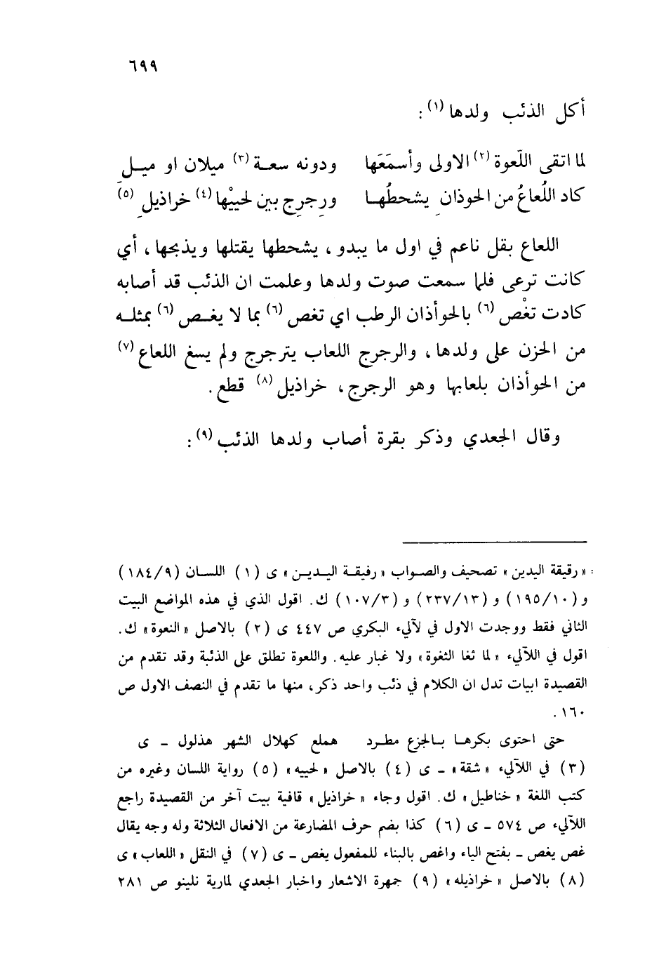 اللعاع بقل ناعم في أول ما يبدو، يشحطها يقتلها ويذبحها، أي كانت ترعى فلما سمعت صوت ولدها وعلمت أن الذئب قد أصابه كادت تغص بالحوأذان الرطب أي تغص بما لا يغص بمثله من الحزن على ولدها، والرجرج اللعاب يترجرج ولم يسغ اللعاع من الحوأذان بلعابها وهو الرجرج، خرازيل قطع. وقال الجعدي وذكر بقرة أصاب ولدها الذئب:
