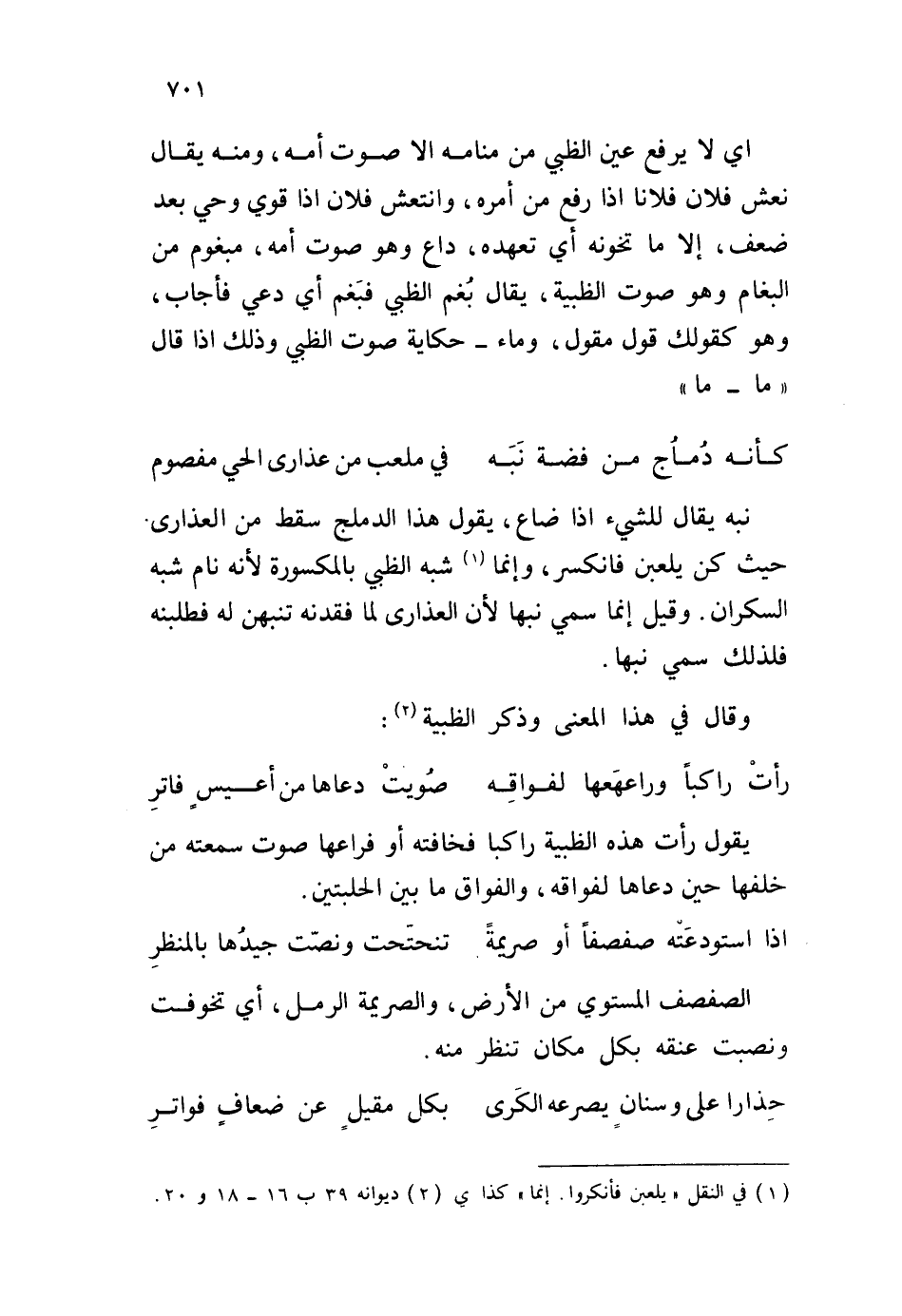 أي لا يرفع عين الظبي من منامه إلا صوت أمه، ومنه يقال نعش فلان فلاناً إذا رفع من أمره، وانتعش فلان إذا قوي وحي بعد ضعف، إلا ما تخونه أي تعهده، داع وهو صوت أمه، مبغوم من البغام وهو صوت الظبية، يقال بغم الظبي فبغم أي دعي فأجاب، وهو كقولك قول مقول، وماء - حكاية صوت الظبي وذلك إذا قال " ما - ما "