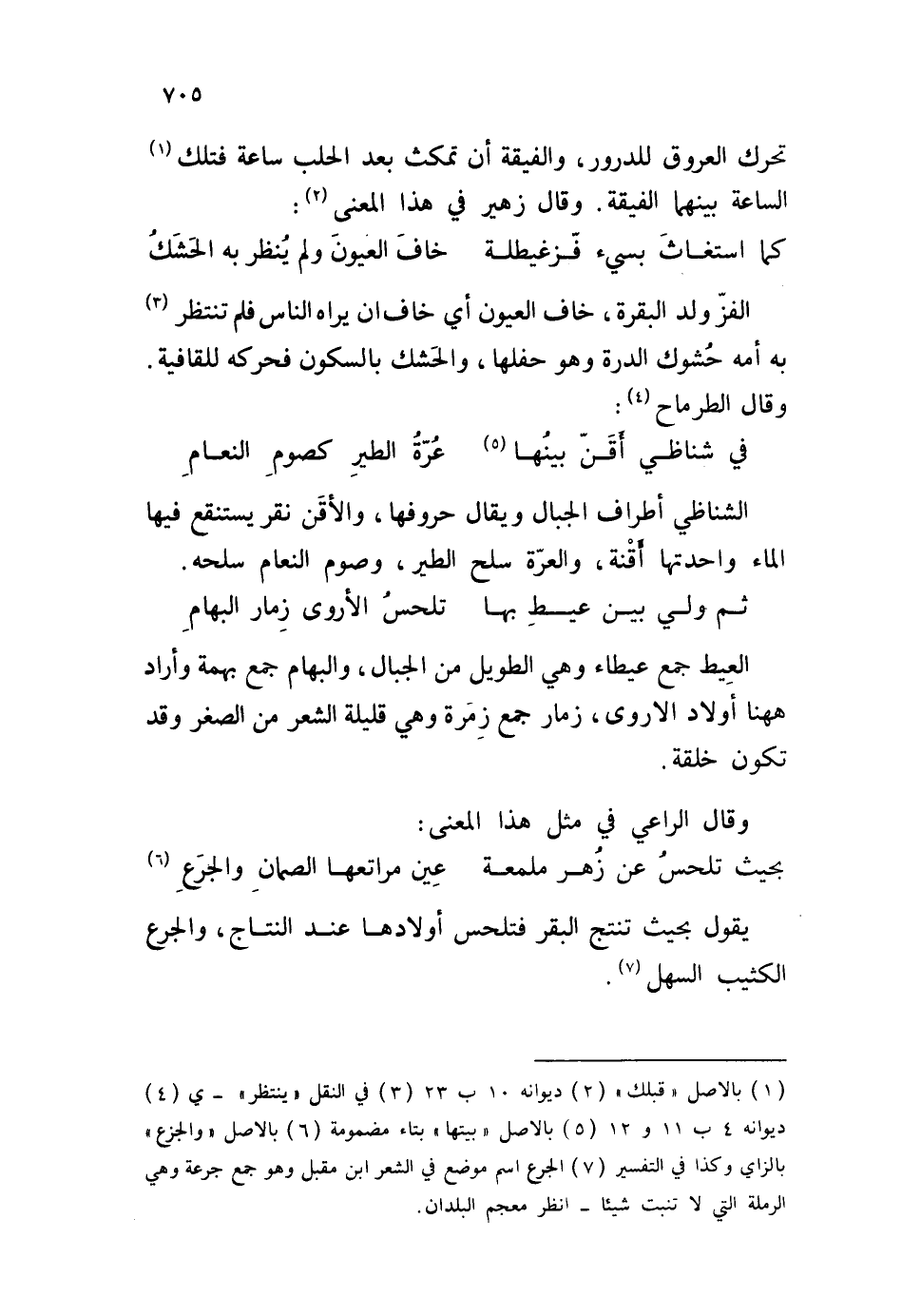 الشناظي أطراف الجبال ويقال حروفها، والأقن نقر يستنقع فيها الماء واحدتها أقنة، والعرّة سلح الطير، وصوم النعام سلحه.