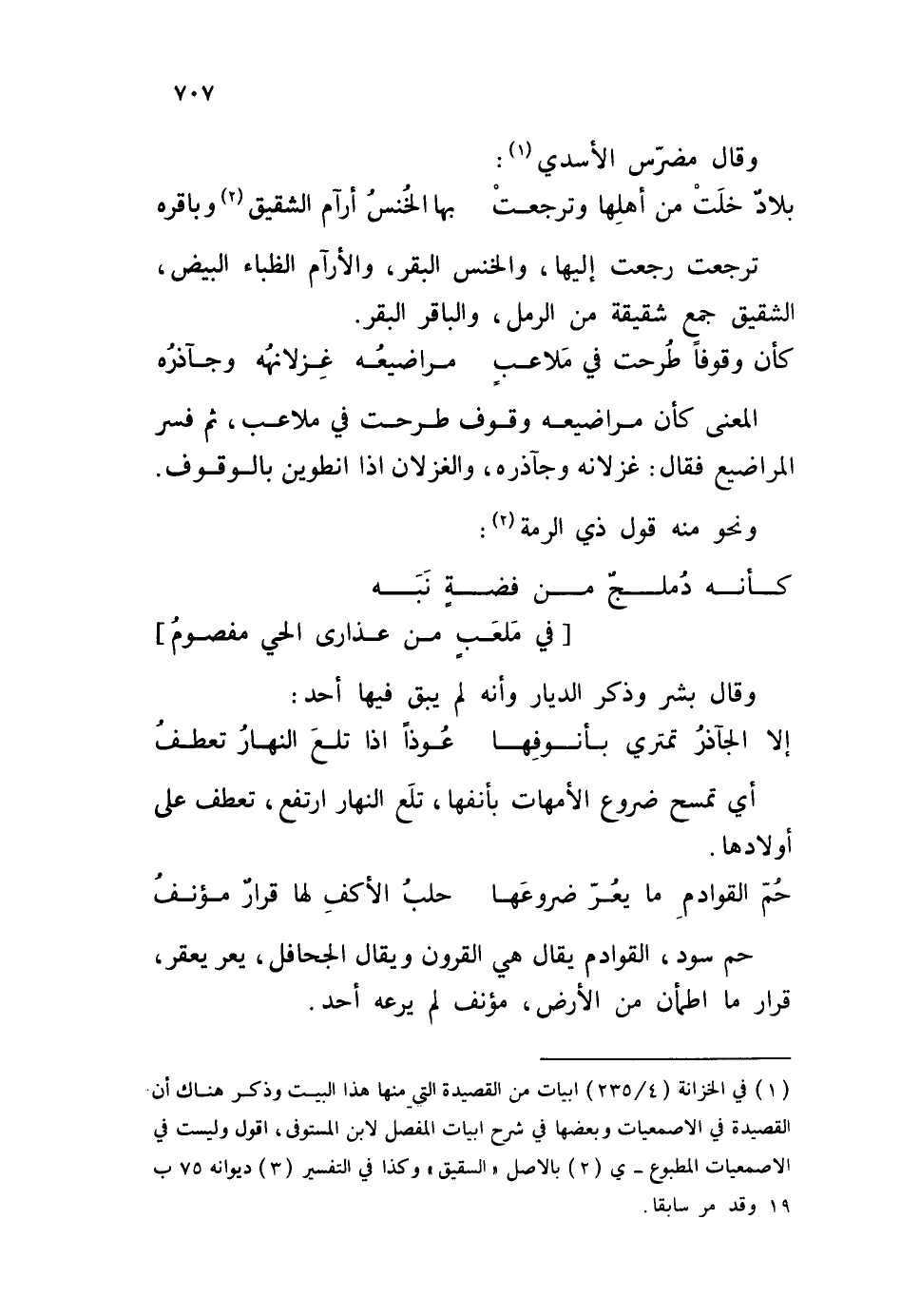 ترجعت رجعت إليها، والخنس البقر، والأرام الظباء البيض، الشقيق جمع شقيقة من الرمل، والباقر البقر.
