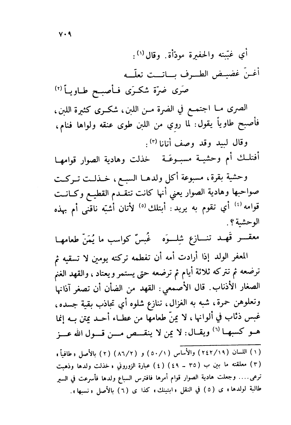 المعفر الولد إذا أرادت أمه أن تفطمه تركته يومين لا تسقيه ثم ترضعه ثم تتركه ثلاثة أيام ثم ترضعه حتى يستمر ويعتاد، والقهد الغنم الصغار الأذناب. قال الأصمعي: القهد من الضأن أن تصغر آذانها وتعلوهن حمرة، شبه به الغزال، تنازع شلوه أي تجاذب بقية جسده، غبس ذئاب في ألوانها، لا يمنّ طعامها من عطاء أحد يمتن به إنما هو كسبها ويقال: لا يمن لا ينقص من قول الله عزّ