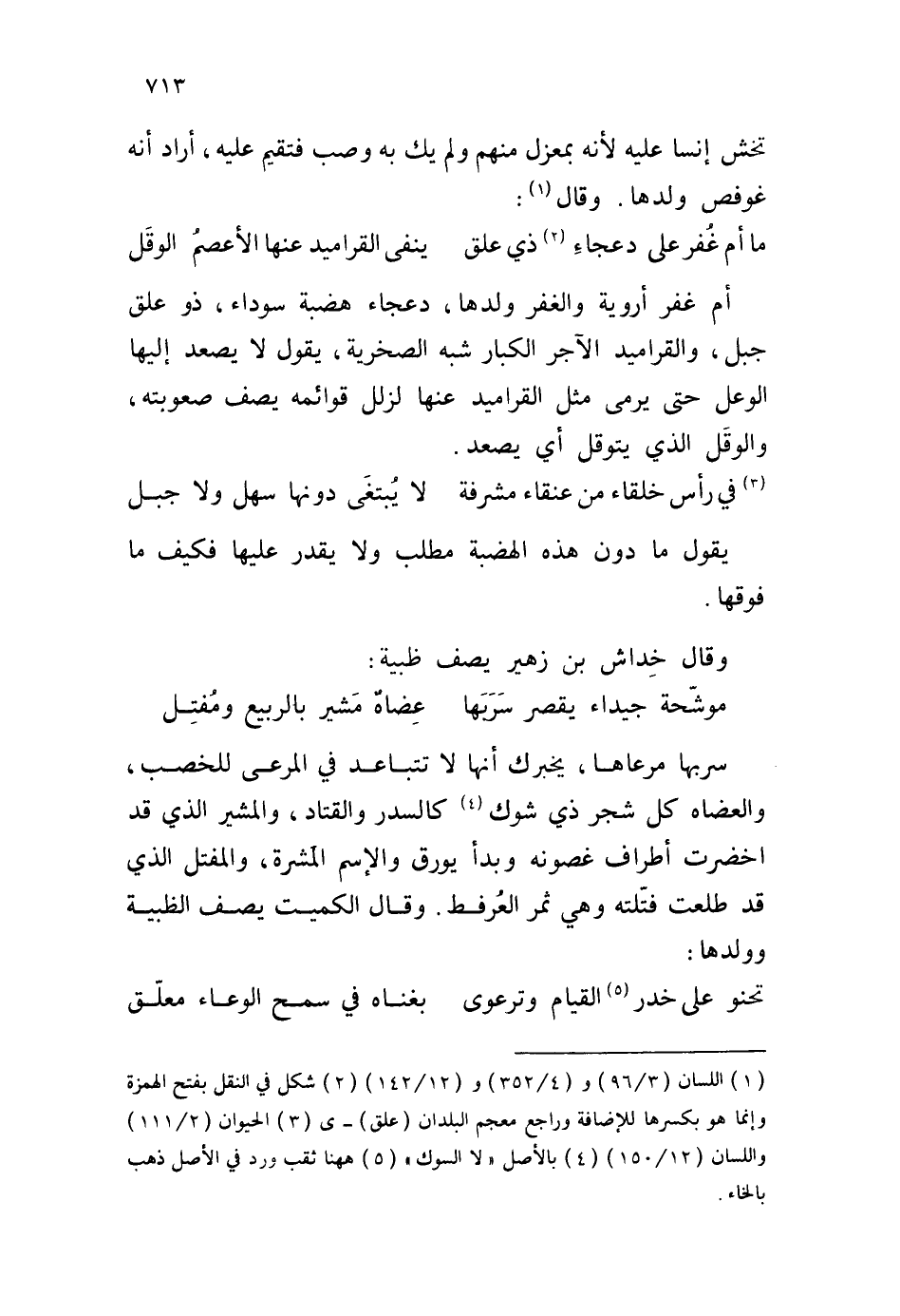 سربها مرعاها، يخبرك أنها لا تتباعد في المرعى للخصب، والعضاه كل شجر ذي شوك كالسدر والقتاد، والمشير الذي قد اخضرت أطراف غصونه وبدأ يورق والإسم المشرة، والمفتل الذي قد طلعت فتّلته وهي ثمر العرفط. وقال الكميت يصف الظبية وولدها: