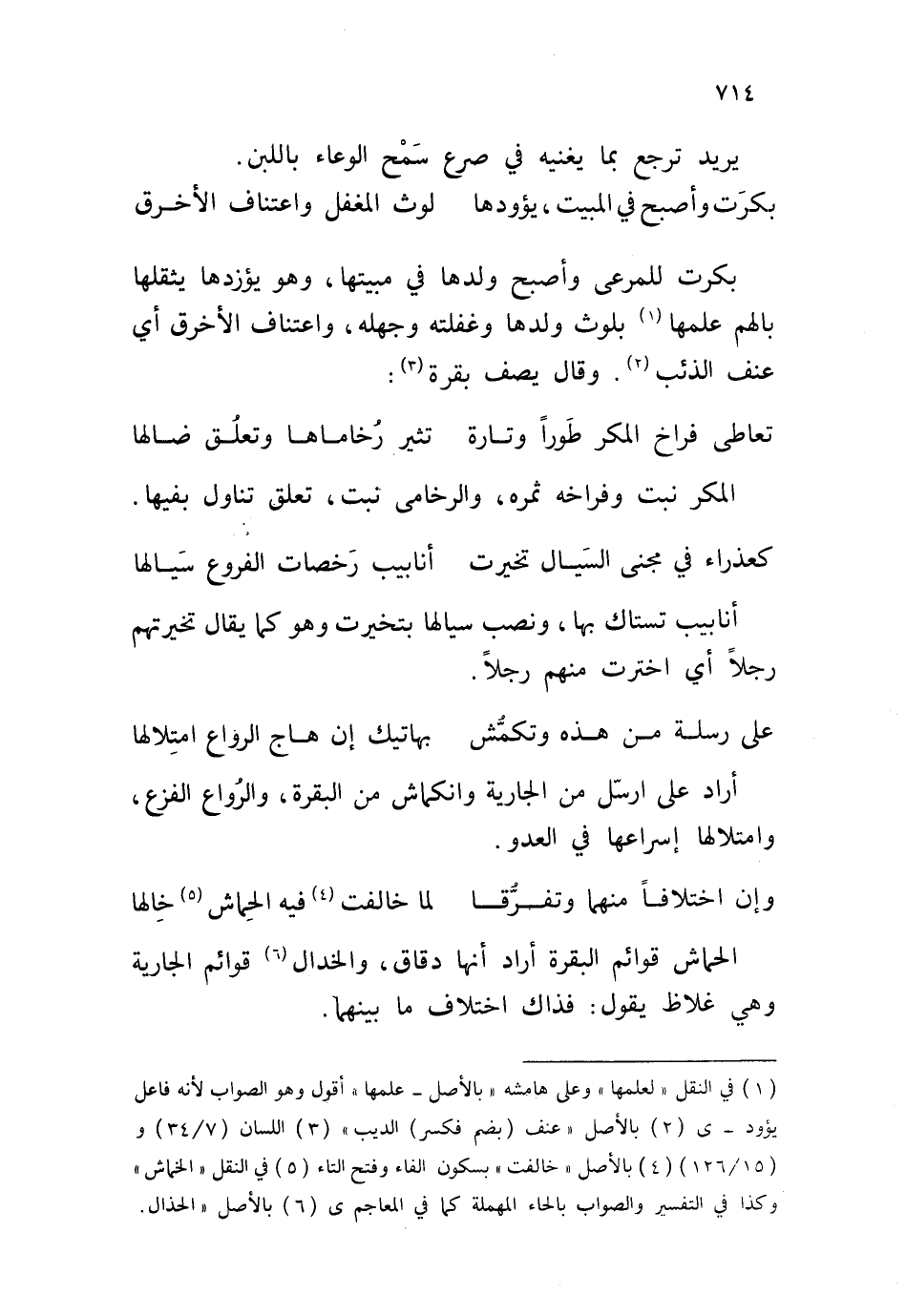 بكرت للمرعى وأصبح ولدها في مبيتها، وهو يؤزدها يثقلها بالهم علمها بلوث ولدها وغفلته وجهله، واعتناف الأخرق أي عنف الذئب. وقال يصف بقرة:
