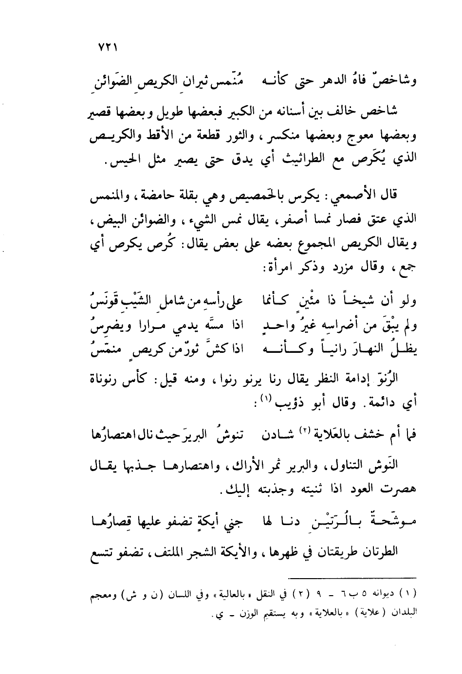 شاخص خالف بين أسنانه من الكبير فبعضها طويل وبعضها قصير وبعضها معوج وبعضها منكسر، والثور قطعة من الأقط والكريص الذي يكرص مع الطراثيث أي يدق حتى يصير مثل الحيس. قال الأصمعي: يكرس بالحمصيص وهي بقلة حامضة، والمنمس الذي عتق فصار نمسا أصفر، يقال نمس الشيء، والضوائن البيض، ويقال الكريص المجموع بعضه على بعض يقال: كرص يكرص أي جمع، وقال مزرد وذكر امرأة: