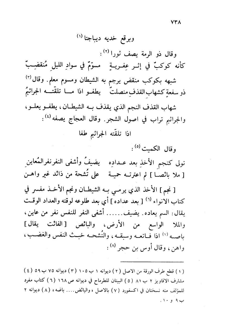 نجم الأخذ الذي يرمي به الشيطان ونجم الأخذ مفسر في كتاب الانواء بعد عداده أي بعد طلوعه لوقته والعداد الوقت يقال: السم يعاد. يضيف أشفى النفر للنفس نفر من عاين، والملا الواسع من الأرض، والبائص الفائت يقال باصه إذا فاتعه وسبقه، والتشحة خبث النفس والغضب، واهن، وقال أوس بن حجر: