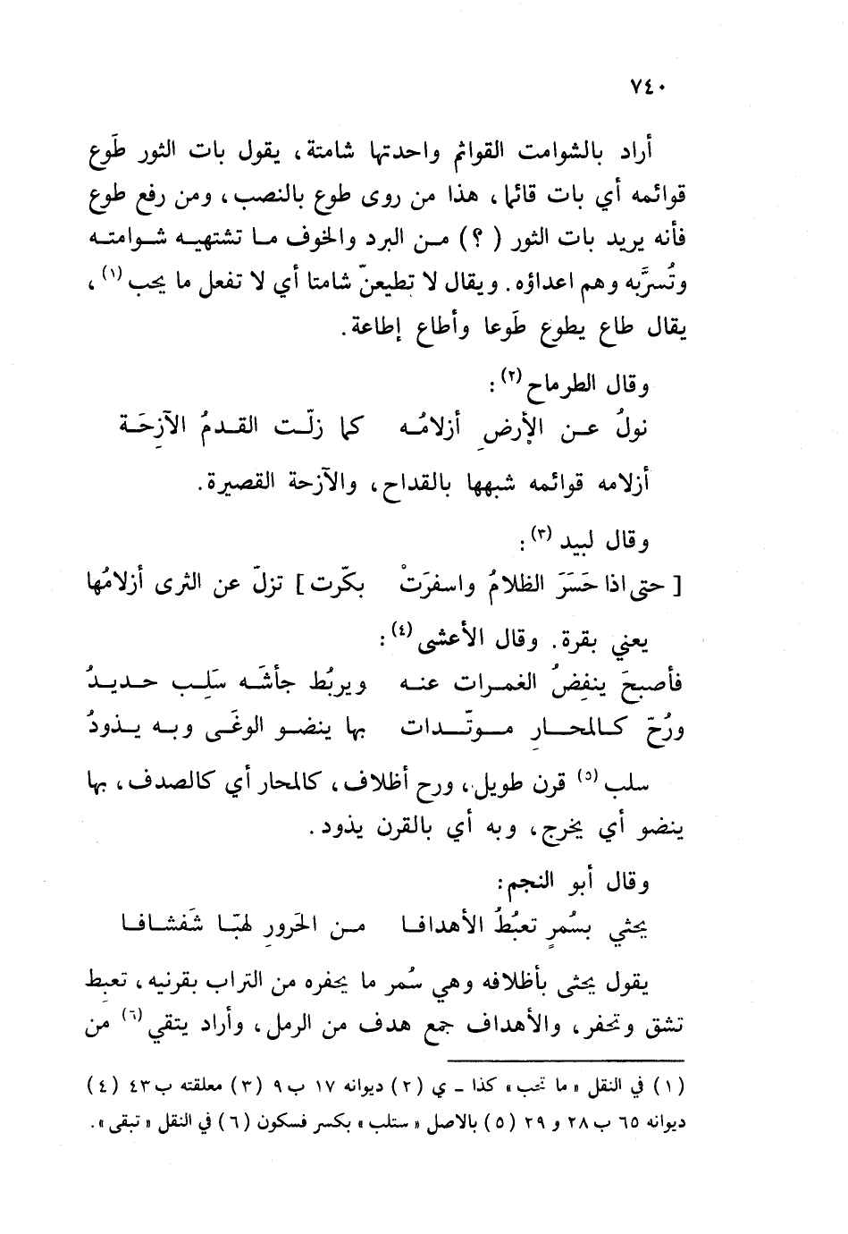 أراد بالشوامت القوائم واحدتها شامتة، يقول بات الثور طوع قوائمه أي بات قائما، هذا من روى طوع بالنصب، ومن رفع طوع فأنه يريد بات الثور من البرد والخوف ما تشتهيه شوامته وتسرّبه وهم أعداؤه. ويقال لا تطيعن شامتا أي لا تفعل ما يحب، يقال طاع يطوع طوعا وأطاع إطاعة. وقال الطرماح: