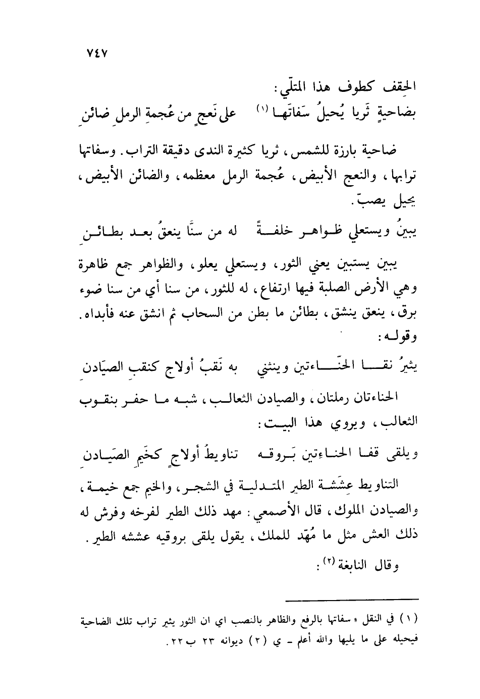 ضاحية بارزة للشمس، ثريا كثيرة الندى دقيقة التراب. وسفاتها ترابها، والنعج الأبيض، عجمة الرمل معظمه، والضائن الأبيض، يحيل يصب.