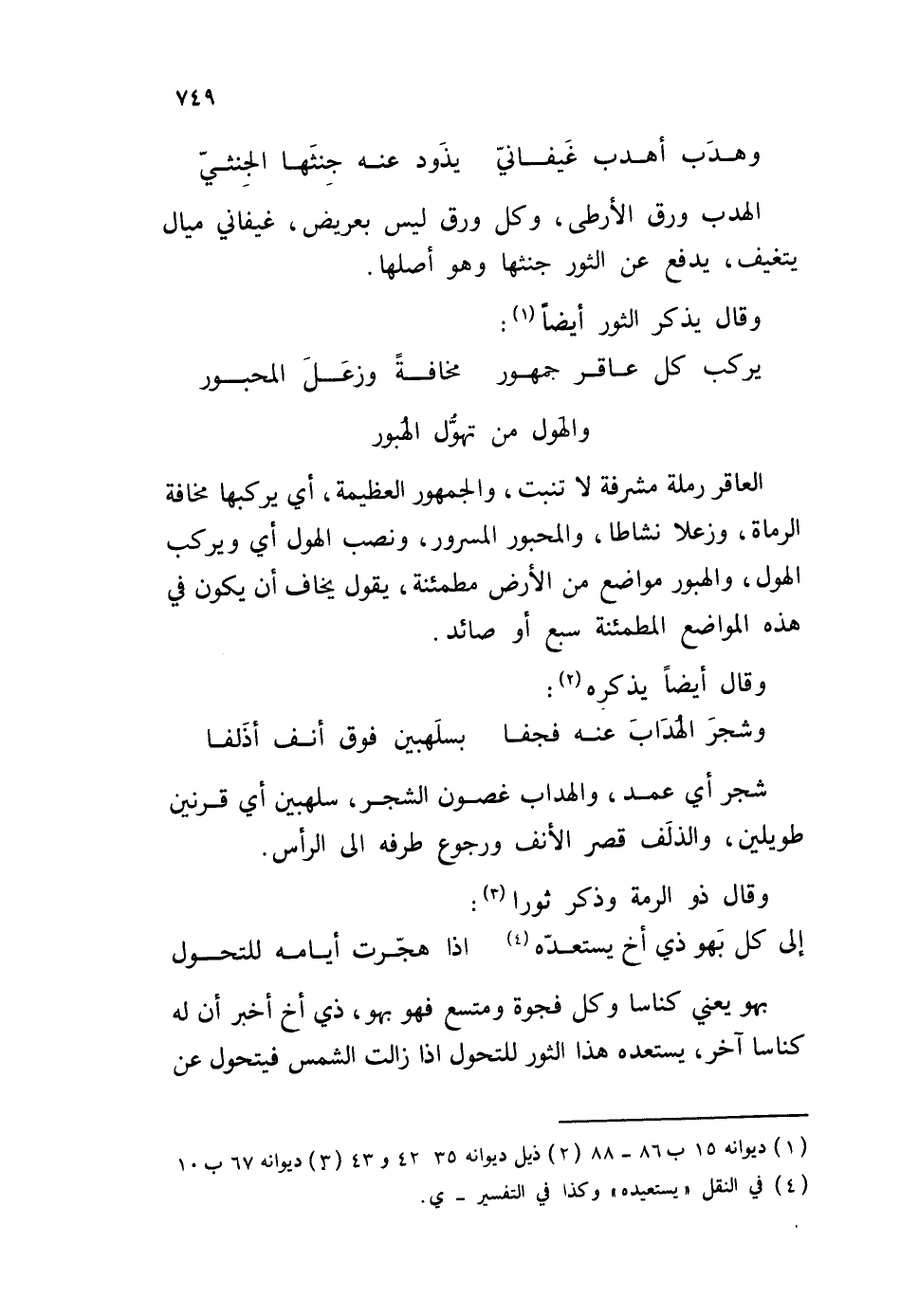 شجر أي عمد، والهداب غصون الشجر، سلهبين أي قرنين طويلين، والذلف قصر الأنف ورجوع طرفه إلى الرأس. وقال ذو الرمة وذكر ثوراً: