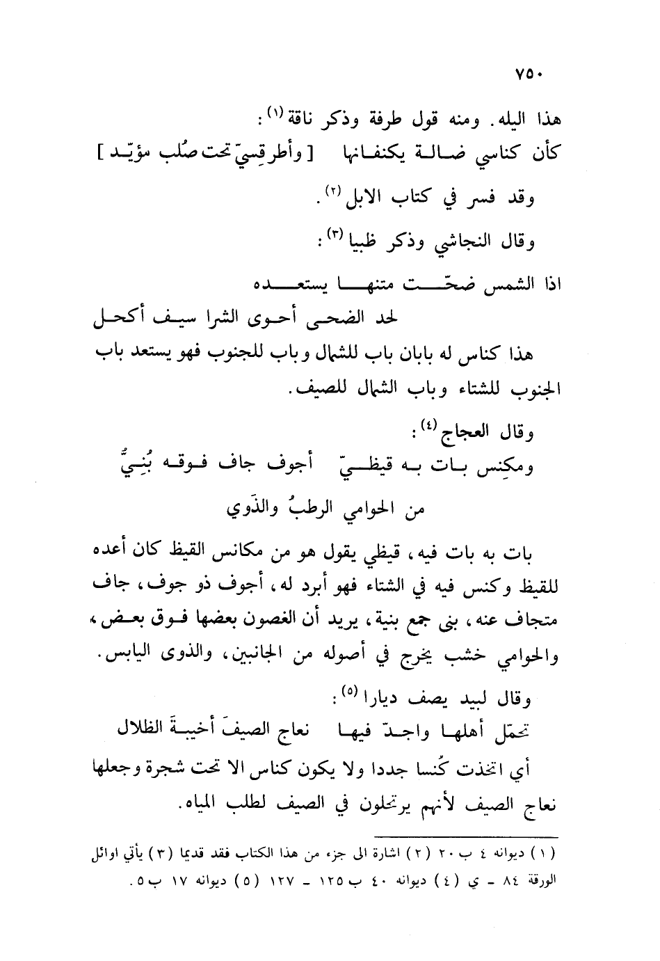 بات به بات فيه، قيظي يقول هو من مكانس القيظ كان أعده للقيظ وكنس فيه في الشتاء فهو أبرد له، أجوف ذو جوف، جاف متجاف عنه، بنى جمع بنية، يريد أن الغصون بعضها فوق بعض، والحوامي خشب يخرج في أصوله من الجانبين، والذوى اليابس.