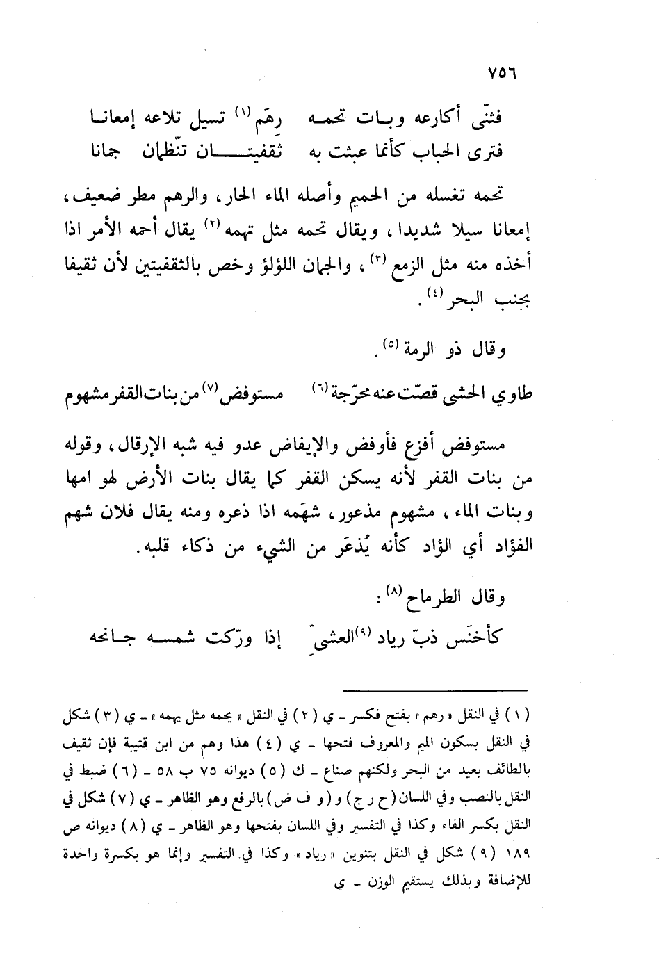 تحمه تغسله من الحميم وأصله الماء الحار، والرهم مطر ضعيف، إمعانا سيلا شديدا، ويقال تحمه مثل تهمه يقال أحمه الأمر إذا أخذه منه مثل الزمع، والجمان اللؤلؤ وخص بالثقفيتين لأن ثقيفا بجنب البحر. وقال ذو الرمة: