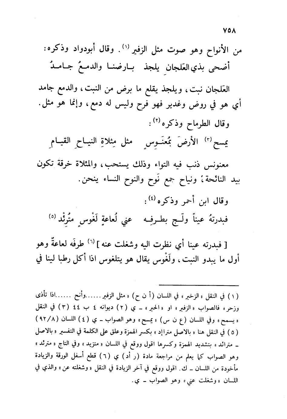 العلجان نبت، ويلجذ يقلع ما برض من النبت، والدمع جامد أي هو في روض وغدير فهو فرح وليس فيه دمع، وإنما هو مثل. وقال الطرماح وذكره: