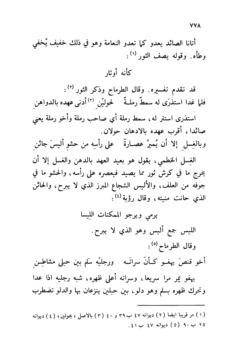 الغسل الخطمي، يقول هو بعيد العهد بالدهن والغسل إلا أن يخرج ما في كرش ثور مما يصيد فيعصره على رأسه، والحشو ما في جوفه من العلف، والأليس الشجاع المبرز الذي لا يبرح، والحائن الذي حانت منيته، وقال رؤبة: