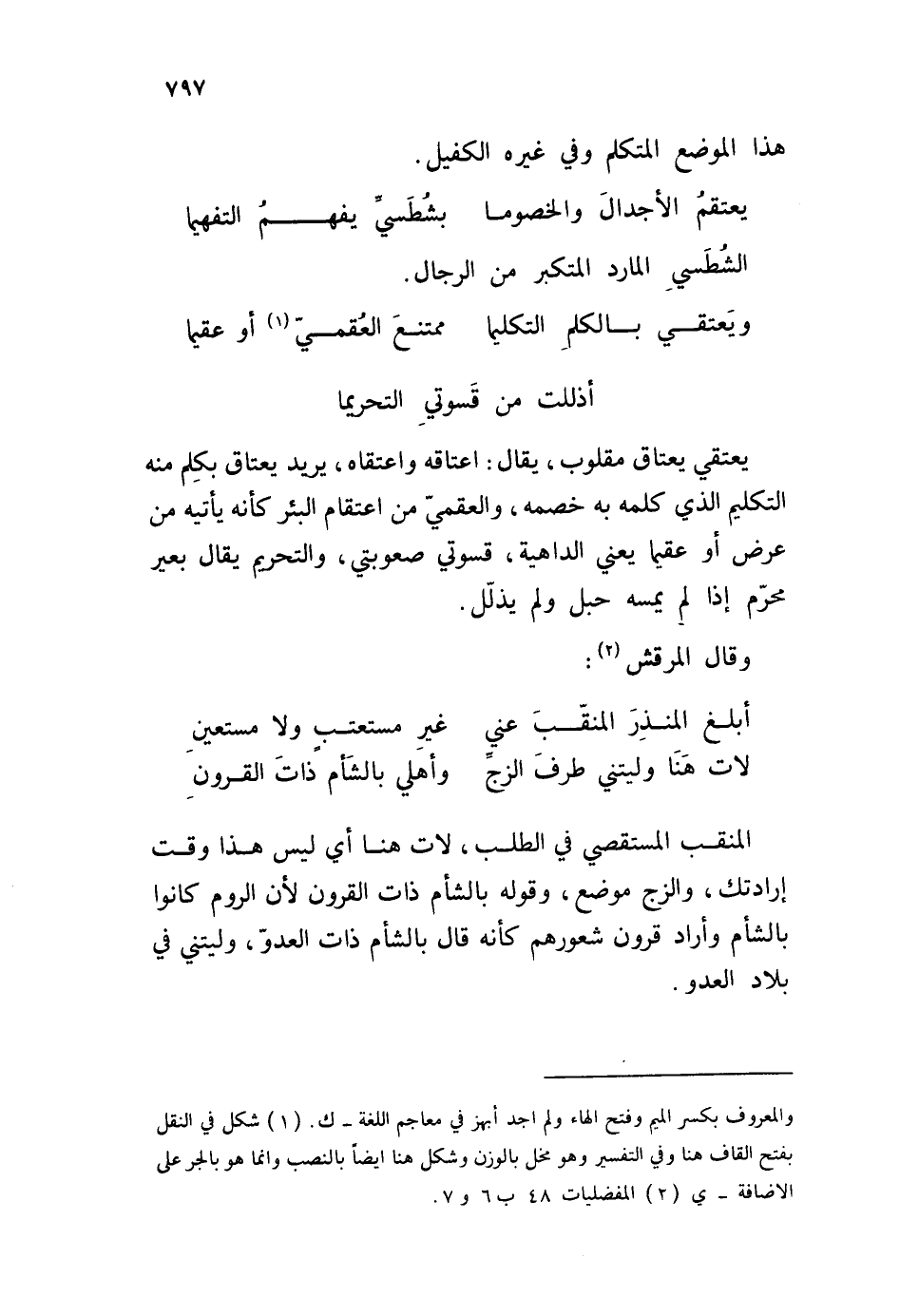 يعتقي يعتاق مقلوب، يقال: اعتاقه واعتقاه، يريد يعتاق بكلم منه التكليم الذي كلمه به خصمه، والعقميّ من اعتقام البئر كأنه يأتيه من عرض أو عقيما يعني الداهية، قسوتي صعوبتي، والتحريم يقال بعير محرّم إذا لم يمسه حبل ولم يذلّل. وقال المرقش: