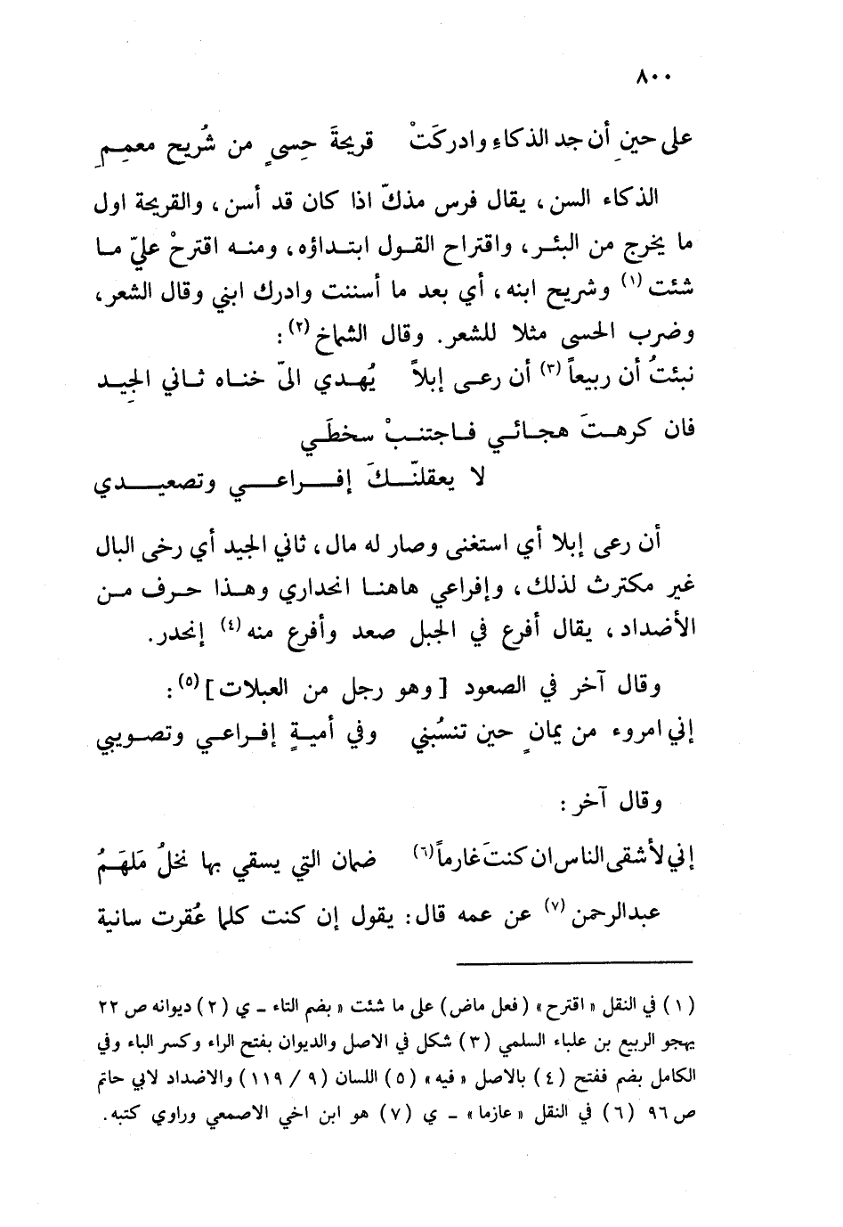 أن رعى إبلا أي استغنى وصار له مال، ثاني الجيد أي رخى البال غير مكترث لذلك، وإفراعي هاهنا انحداري وهذا حرف من الأضداد، يقال أفرع في الجبل صد وأفرع منه إنحدر. وقال آخر في الصعود وهو رجل من العبلات: