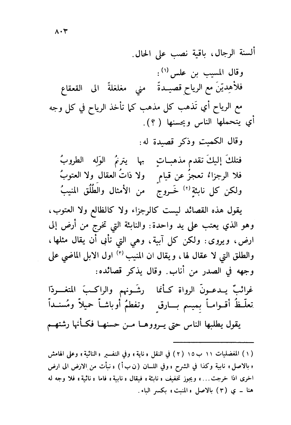 يقول هذه القصائد ليست كالرجزاء ولا كالظالع ولا العتوب، وهو الذي يعتب على يد واحدة: والنابئة التي تخرج من أرض إلى أرض، ويروى: ولكن كل آبية، وهي التي تأبى أن يقال مثلها، والطلق التي لا عقال لها، ويقال ان المنيب أول الابل الماضي على وجهه في الصدر من أناب. وقال يذكر قصائده: