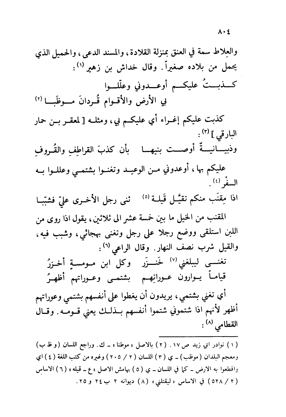والعلاط سمة في العنق بمنزلة القلادة، والمسند الدعى، والحميل الذي يحمل من بلاده صغيراً. وقال خداش بن زهير: