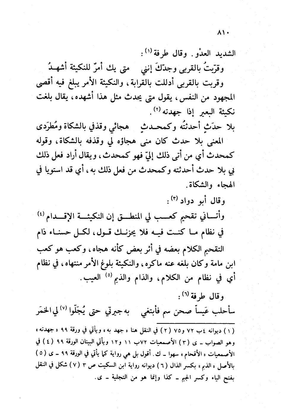 المعنى بلا حدث كان منى هجاؤه لي وقذفه بالشكاة، وقوله كمحدث أي من أتى ذلك إليّ فهو كمحدث، ويقال أراد فعل ذلك بي بلا حدث أحدثته وكمحدث من فعل ذلك به، أي قد استويا في الهجاء والشكاة. وقال أبو دواد: وأتاني تقحيم كعب لي المنطق إن النكيثة الإقدام في نظام ما كنت فيه فلا يحزنك قول، لكل حسناء ذام التقحيم الكلام بعضه في أثر بعض كأنه هجاه، وكعب هو كعب ابن مامة وكان بلغه عنه ماكره، والنكيثة بلوغ الأمر منتهاه، في نظام أي في نظام من الكلام، والذام والذيم العيب. وقال طرفة: