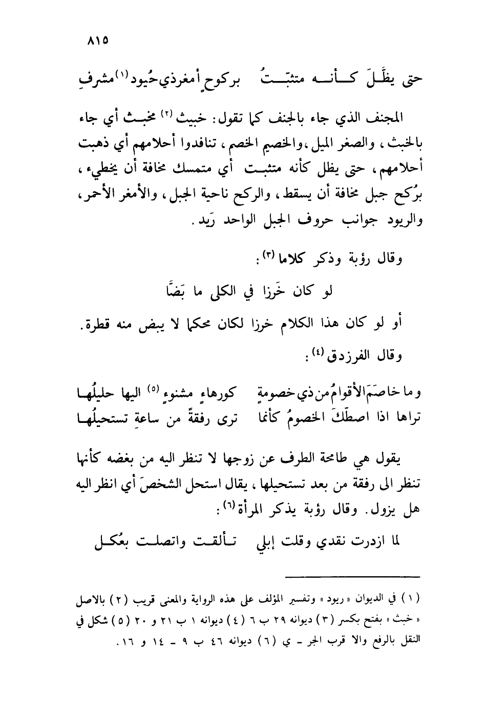المجنف الذي جاء بالجنف كما تقول: خبيث مخبث أي جاء بالخبث، والصغر الميل، والخصيم الخصم، تنافدوا أحلامهم أي ذهبت أحلامهم، حتى يظل كأنه متثبت أي متمسك مخافة أن يخطيء، برُكح جبل مخافة أن يسقط، والركح ناحية الجبل، والأمغر الأَحمر، والريود جوانب حروف الجبل الواحد رَيد. وقال رؤبة وذكر كلاما: