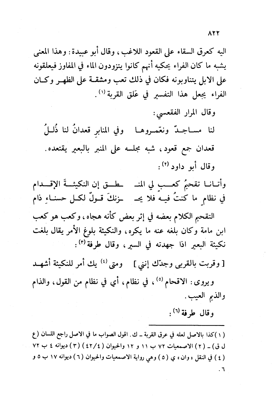 إليه كعرق السقاء على القعود اللاغب، وقال أبو عبيدة: وهذا المعنى يشبه ما كان الفراء يحكيه أنهم كانوا يتزودون الماء في المفاوز فيعلقونه على الابل يتناوبونه فكان في ذلك تعب ومشقة على الظهر وكان الفراء يجعل هذا التفسير في عَلق القربة. وقال المرار الفقعسي: