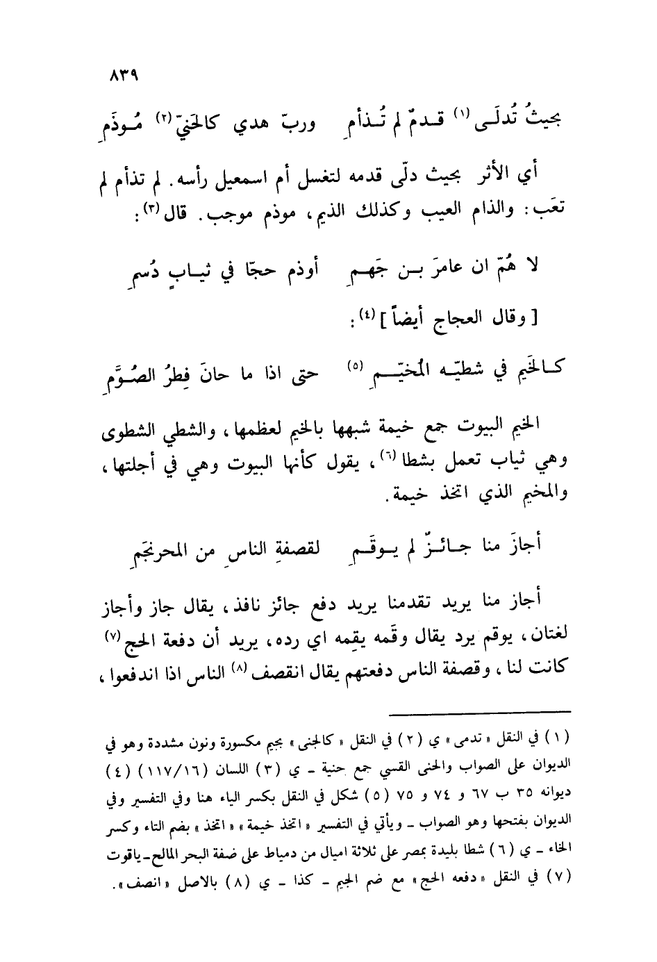 أجاز منا يريد تقدمنا يريد دفع جائز نافذ، يقال جاز وأجاز لغتان، يوقم يرد يقال وقَمه يقمه أي رده، يريد أن دفعة الحج كانت لنا، وقصفة الناس دفعتهم يقال انقصف الناس إذا اندفعوا،