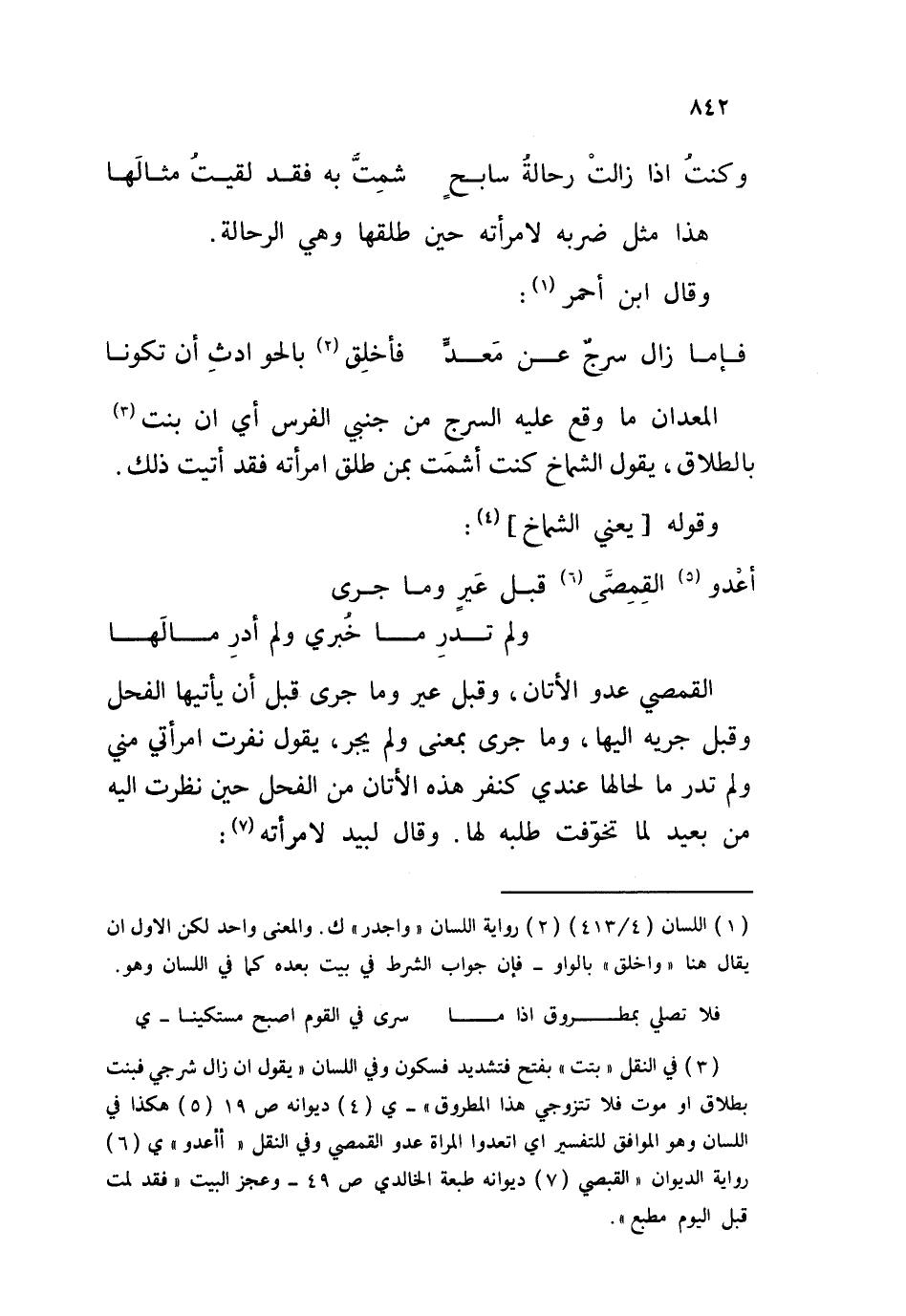 القمصي عدو الأتان، وقبل عير وما جرى قبل أن يأتيها الفحل وقبل جريه إليها، وما جرى بمعنى ولم يجر، يقول نفرت امرأتي مني ولم تدر ما لحالها عندي كنفر هذه الأتان من الفحل حين نظرت إليه من بعيد لما تخوّفت طلبه لها. وقال لبيد لامرأته: