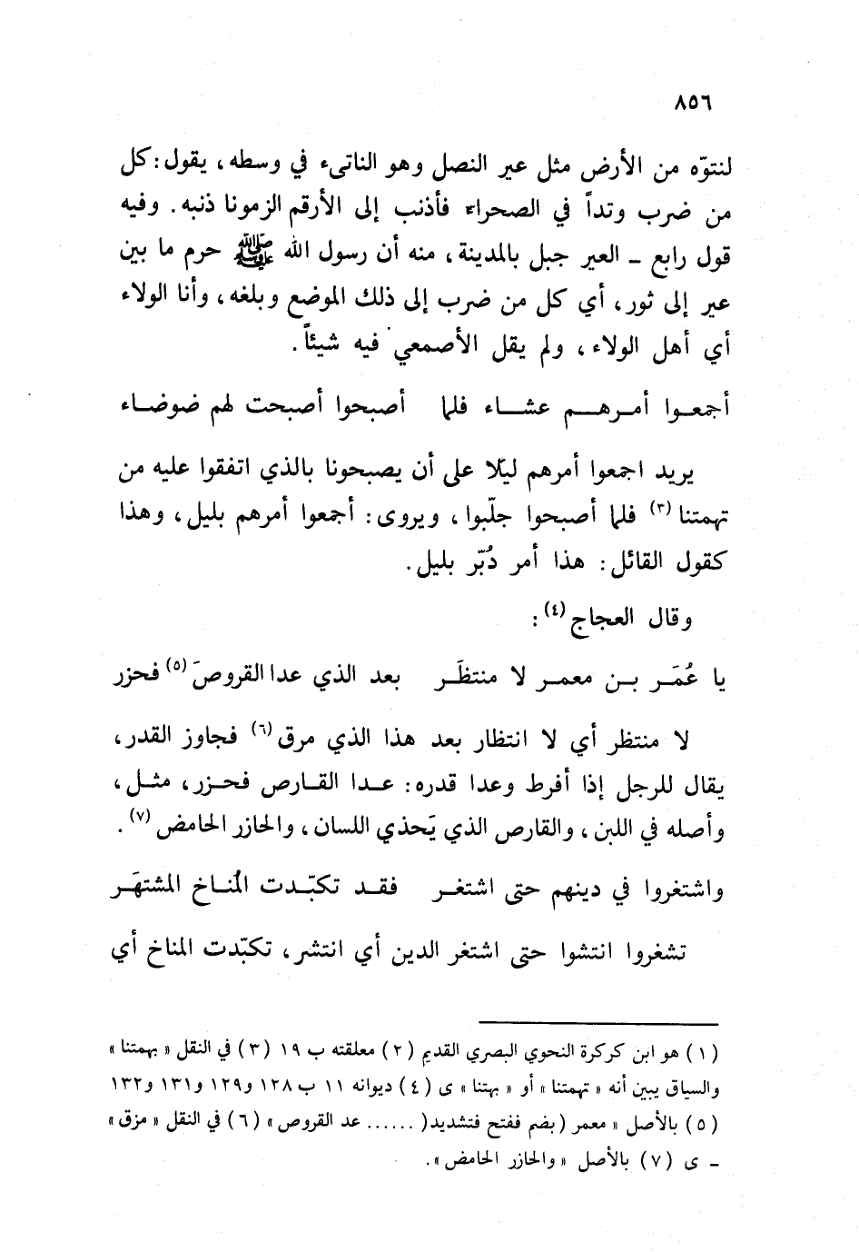 لنتوّه من الأرض مثل عير النصل وهو الناتىء في وسطه، يقول: كل من ضرب وتداً في الصحراء فأذنب إلى الأرقم ألزمونا ذنبه. وفيه قول رابع - العير جبل بالمدينة، منه أن رسول الله صلى الله عليه وسلم حرم ما بين عير إلى ثور، أي كل من ضرب إلى ذلك الموضع وبلغه، وأنا الولاء أي أهل الولاء، ولم يقل الأصمعي فيه شيئاً.