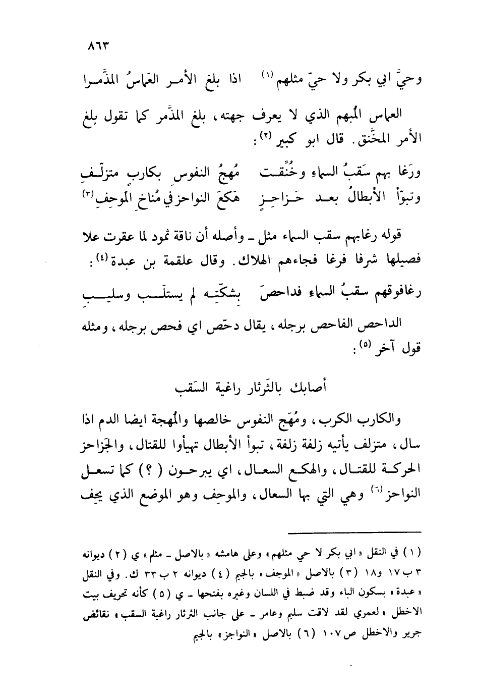 والكارب الكرب، ومهَج النفوس خالصها والمهجة أيضا الدم إذا سال، متزلف يأتيه زلفة زلفة تبوأ الأبطال تهيأوا للقتال، والجزاحز الحركة للقتال، والهكع السعال، أي يبرحون؟ كما تسعل النواحز وهي التي بها السعال، والموحف وهو الموضع الذي يحِف