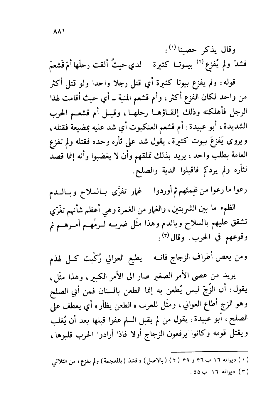 قوله: ولم يفزع بيوتا كثيرة أي قتل رجلا واحدا ولو قتل أكثر من واحد لكان الفزع أكثر، وأم قشعم المنية - أي حيث أقامت لهذا الرجل فأهلكته وذلك إلقاؤها رحلها، وقيل أم قشعم الحرب الشديدة، أبو عبيدة: أم قشعم العنكبوت أي شد عليه بمضيعة فقتله، ويروى يَفزع بيوت كثيرة، يقول شد على ثأره وحده فقتله ولم تفزع العامة بطلب واحد، يريد بذلك تملقهم وأن لا يغضبوا وأنه إنما قصد لثأره ولم يردكم فاقبلوا الدية والصلح.