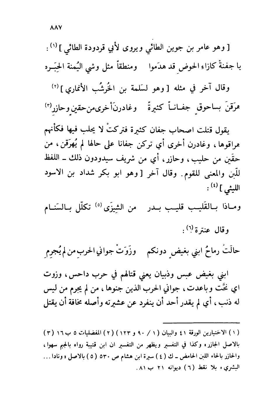 يقول قتلت أصحاب جفان كثيرة فتكتْ لا يحلب فيها فكأنهم هراقوها، وغادرن أخرى أي تركن جفانا على حالها لم يُهرَقن، من حقَين من حليب، وحازر، أي من شريف سيدودون ذلك - اللفظ للّبن والمعنى للقوم. وقال آخر وهو أبو بكر شداد بن الأسود الليثي: