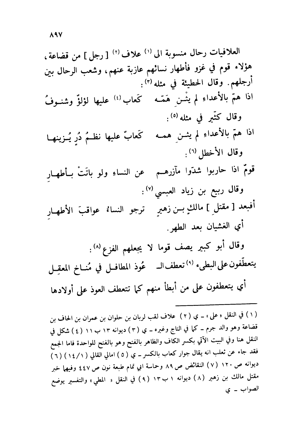 العلافيات رحال منسوبة إلى علاف رجل من قضاعة، هؤلاء قوم في غزو فأطهار نسائهم عازبة عنهم، وشعب الرحال بين أرجلهم. وقال الحطيئة في مثله: