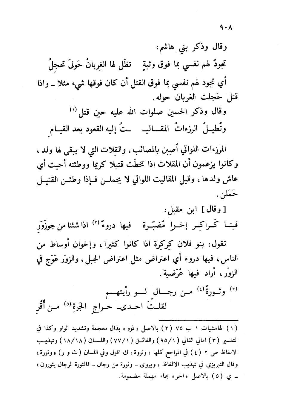 أي تجود لهم نفسي بما فوق القتل أن كان فوقها شيء مثلا - وإذا قتل حَجلت الغربان حوله. وقال وذكر الحسين صلوات الله عليه حين قتل