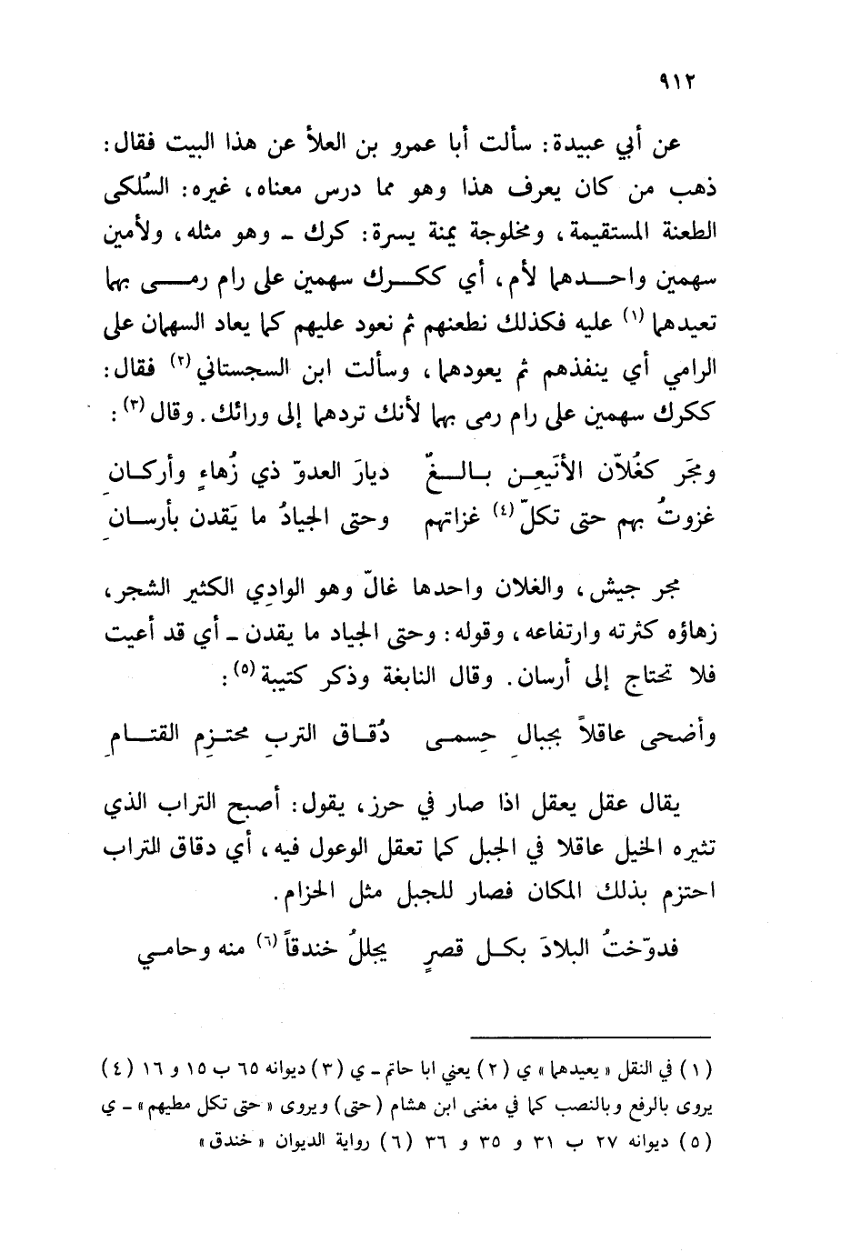 عن أبي عبيدة: سألت أبا عمرو بن العلأ عن هذا البيت فقال: ذهب من كان يعرف هذا وهو مما درس معناه، غيره: السُلكى الطعنة المستقيمة، ومخلوجة يمنة يسرة: كرك - وهو مثله، ولأمين سهمين واحدهما لأم، أي ككرك سهمين على رام رمى بهما تعيدهما عليه فكذلك نطعنهم ثم نعود عليهم كما يعِاد السهمان على الرامي أي ينفذهم ثم يعودهما، وسألت ابن السجستاني فقال: ككرك سهمين على رام رمى بهما لأنك تردهما إلى ورائك. وقال: