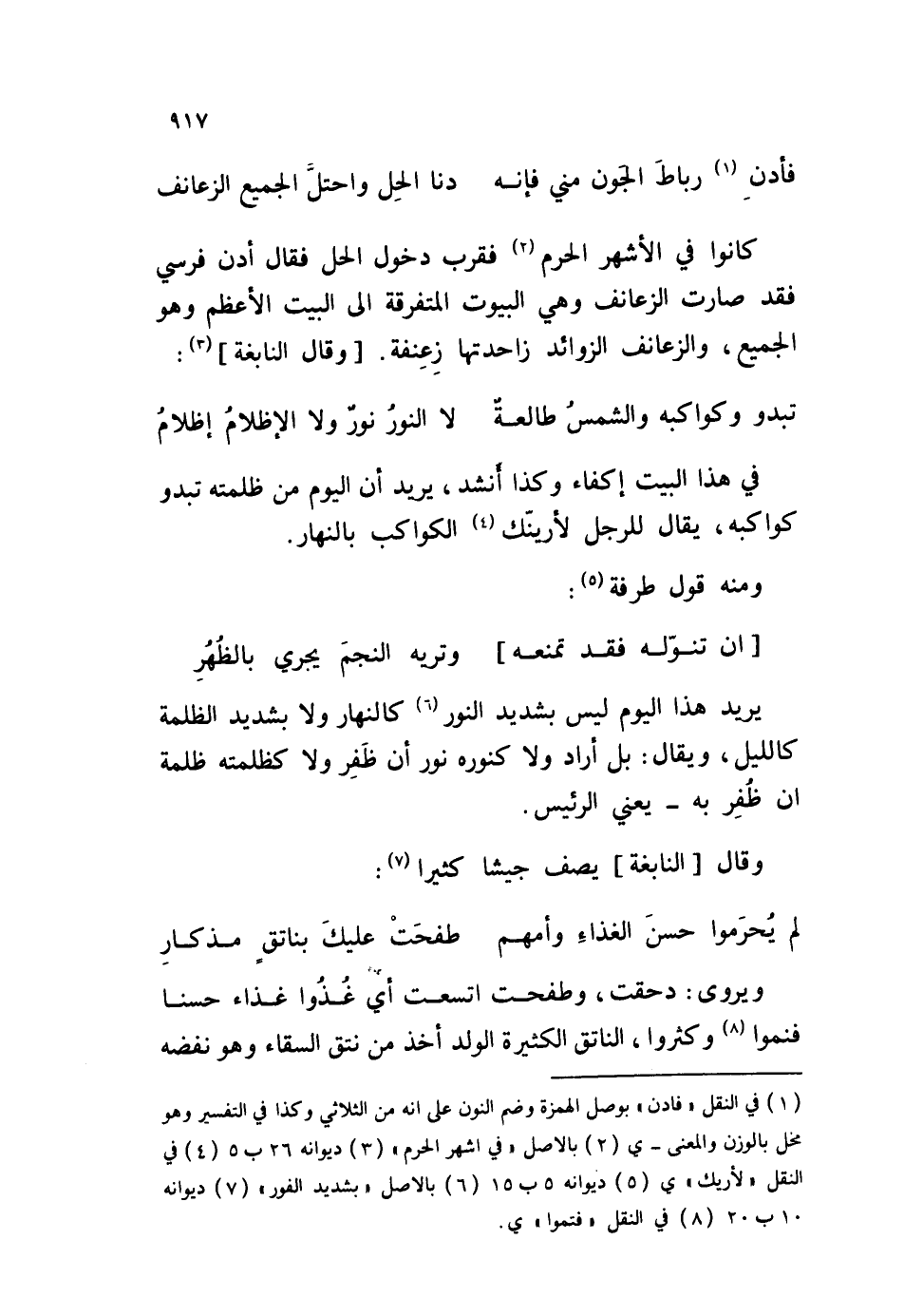 كانوا في الأشهر الحرم فقرب دخول الحل فقال أدن فرسي فقد صارت الزعانف وهي البيوت المتفرقة إلى البيت الأعظم وهو الجميع، والزعانف الزوائد واحدتها زِعِنفة. وقال النابغة: