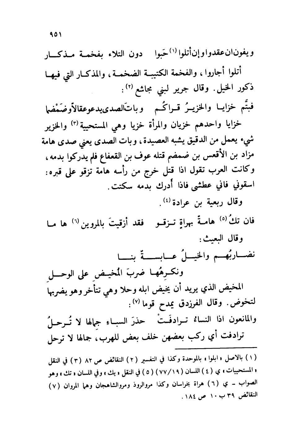 خزايا واحدهم خزيان والمرأة خزيا وهي المستحيية والخزير شيء يعمل من الدقيق يشبه العصيدة، وبات الصدى يعني صدى هامة مزاد بن الأقعس بن ضمضم قتله عوف بن القعفاع فلم يدركوا بدمه، كانت العرب تقول إذا قتل خرج من رأسه هامة تزقو على قبره: اسقوني فإني عطشى فإذا أدرك بدمه سكتت. وقال ربعية بن عرادة.