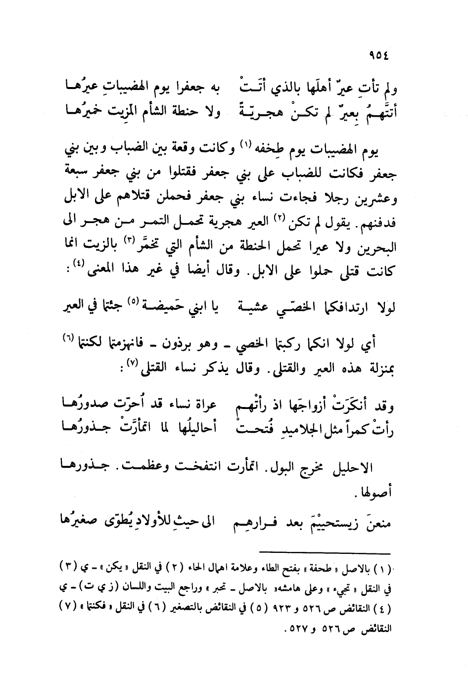 يوم الهضيبات يوم طِخفه وكانت وقعة بين الضباب وبين بني جعفر فكانت للضباب على بني جعفر فقتلوا من بنيِ جعفر سبعة وعشرين رجلا فجاءت نساء بني جعفر فحملن قتلاهم على الإبل فدفنهم. يقول لم تكن العير هجرية تحمل التمر من هجر إلى البحرين ولا عيرا تحمل الحنطة من الشأم التي تخمَّر بالزيت إنما كانت قتلى حلوا على الإبل.