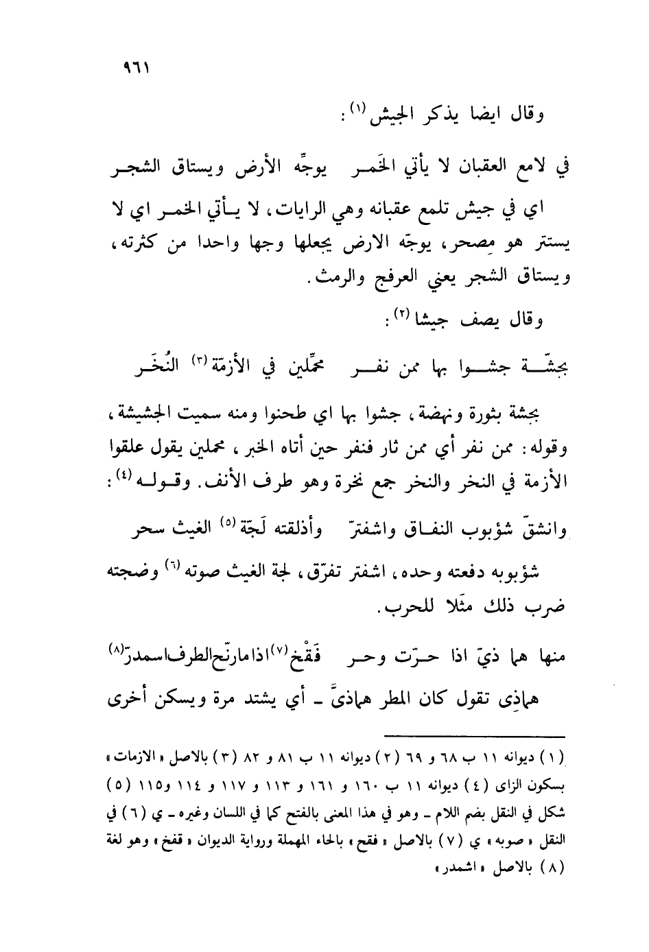 أي في جيش تلمع عقبانه وهي الرايات، لا يأتي الخمر أي لا هو مِصحر، يوجّه الأرض يجعلها وجها واحدا من كثرته، ويستق الشجر يعني العرفج والرمث.