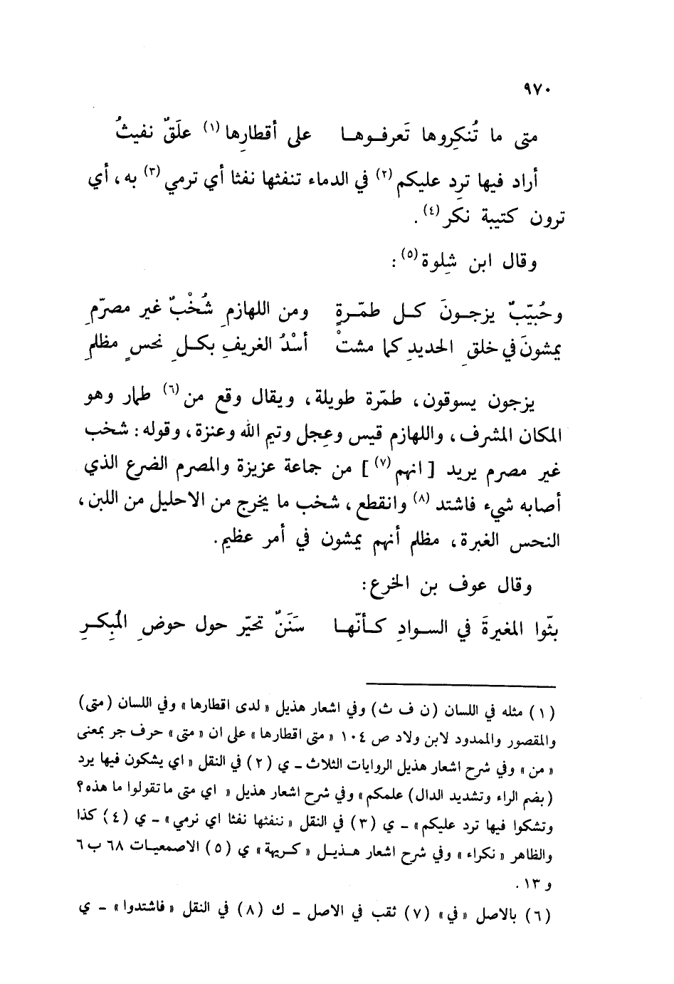 يزجون يسوقون، طمّرة طويلة، ويقال وقع من طمار وهو المكان المشرف، واللهازم قيس وعِجل وتيم الله وعنزة، وقوله: شخب غير مصرم يريد أنهم من جماعة عزيزة والمصرم الضرع الذي أصابه شيء فاشتد وانقطع، شخب ما يخرج من الإحليل من اللبن، النحس الغبرة، مظلم أنهم يمشون في أمر عظيم. وقال عوف بن الخرع: