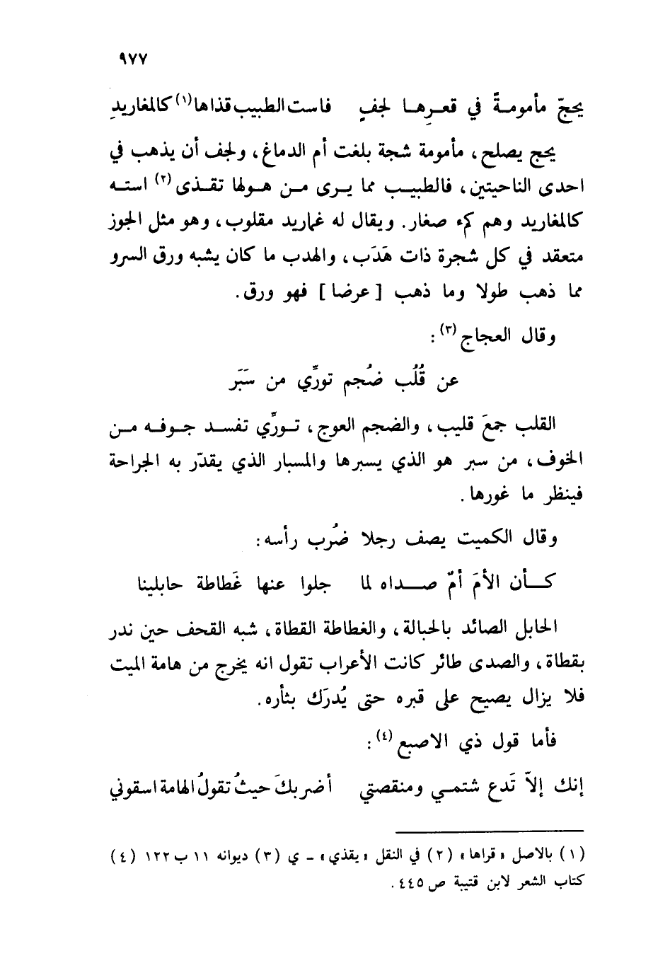 يحج يصلح، مأمومة شجة بلغت أم الدماغ، ولجف أن يذهب في إحدى الناحيتين، فالطبيب مما يرى من هولها تقذى استه كالمغاريد وهم كمء صغار. ويقال له غماريد مقلوب، وهو مثل الجوز فعقد في كل شجرة ذات هدَب، والهدب ما كان يشبه ورق السرو مما ذهب طولا وما ذهب عرضا فهو ورق. وقال العجاج: