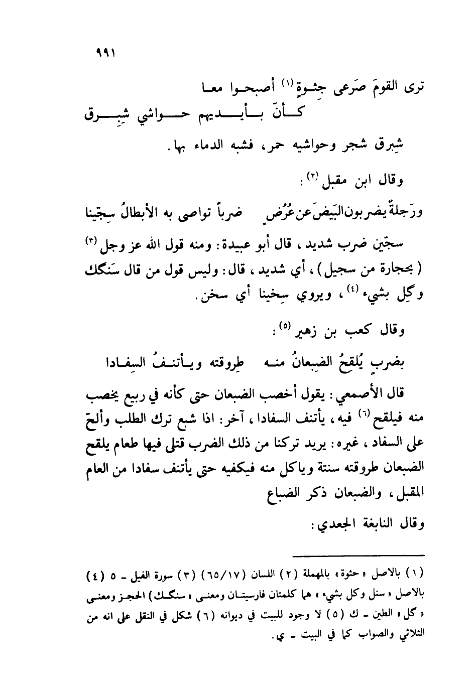 قال الأصمعي: يقول أخصب الضبعان حتى كأنه في ربيع يخصب فيلقح فيه، يأتنف السفادا، آخر: إذا شبع ترك الطلب وألحّ على السفاد، غيره: يريد تركنا من ذلك الضرب قتلى فيها طعام يلقح الضبعان طروقته سنتة ويأكل منه فيكفيه حتى يأتنف سفاداً من العام المقبل، والضبعان ذكر الضباع وقال النابغة الجعدي: